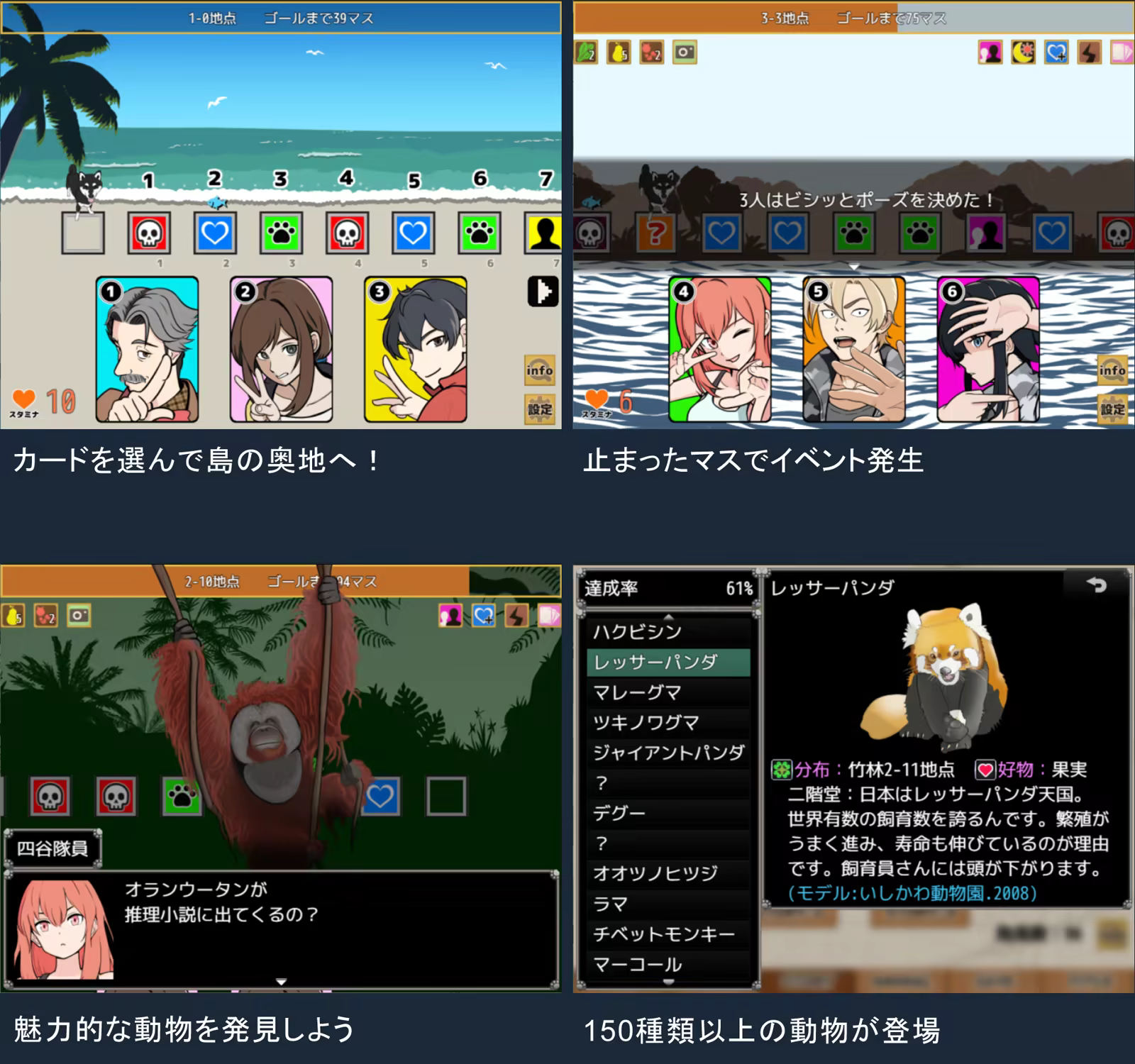 『一橋動物記』は探検隊を率いて、野生動物あふれる「謎の島」の最深部を目指す、探検アドベンチャーゲームです。 道中、動物を発見するとポイントがたまり、アイテムを手に入れたり、探検隊を強化するスキルを習得できます。工夫して島の奥地へと進みましょう。 150種を超える動物たちとの出会い。スタミナとリソース管理が重要なスゴロクマップの探検。そして探検隊が巻き込まれていく陰謀渦巻くストーリーをお楽しみください。