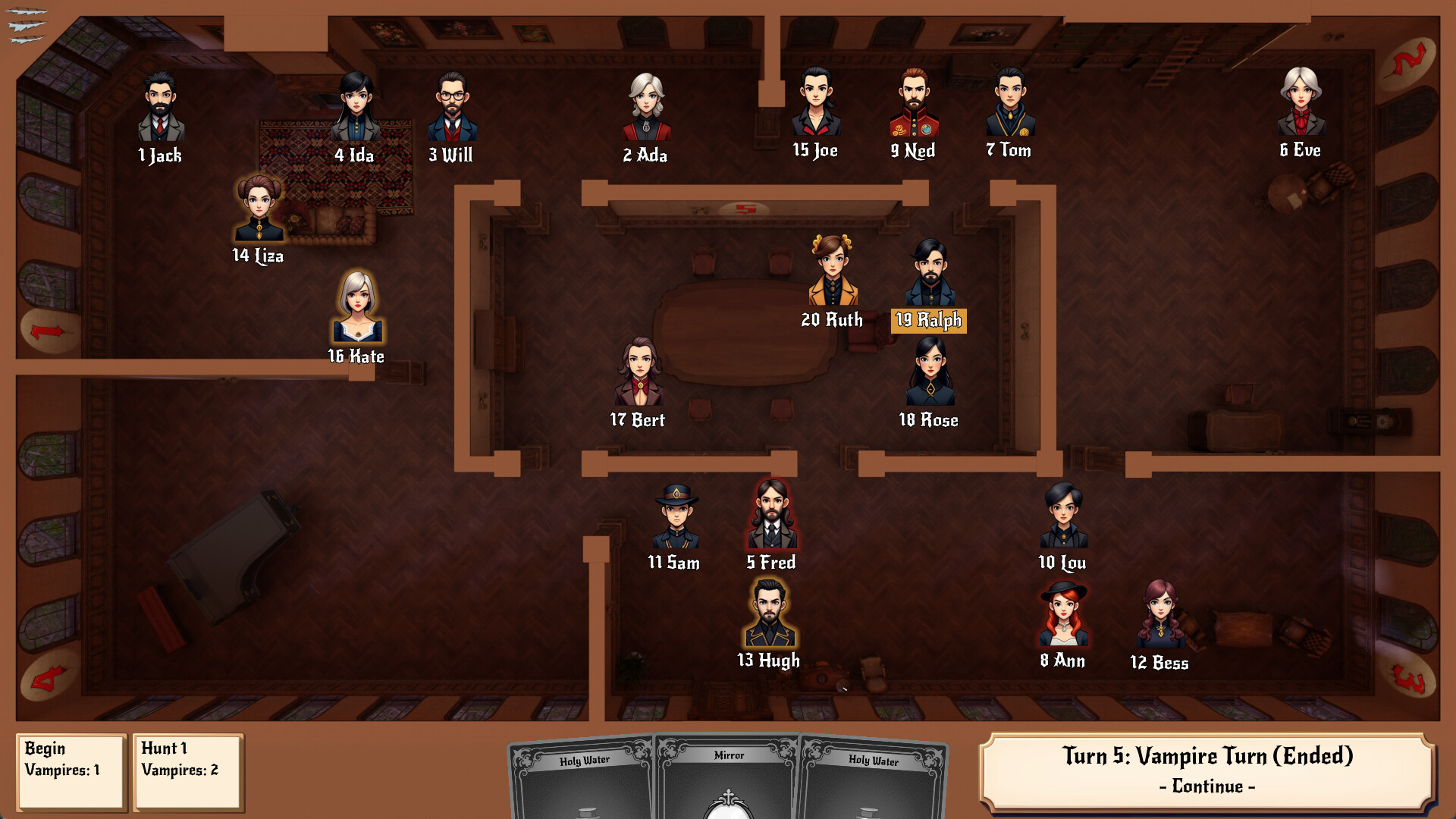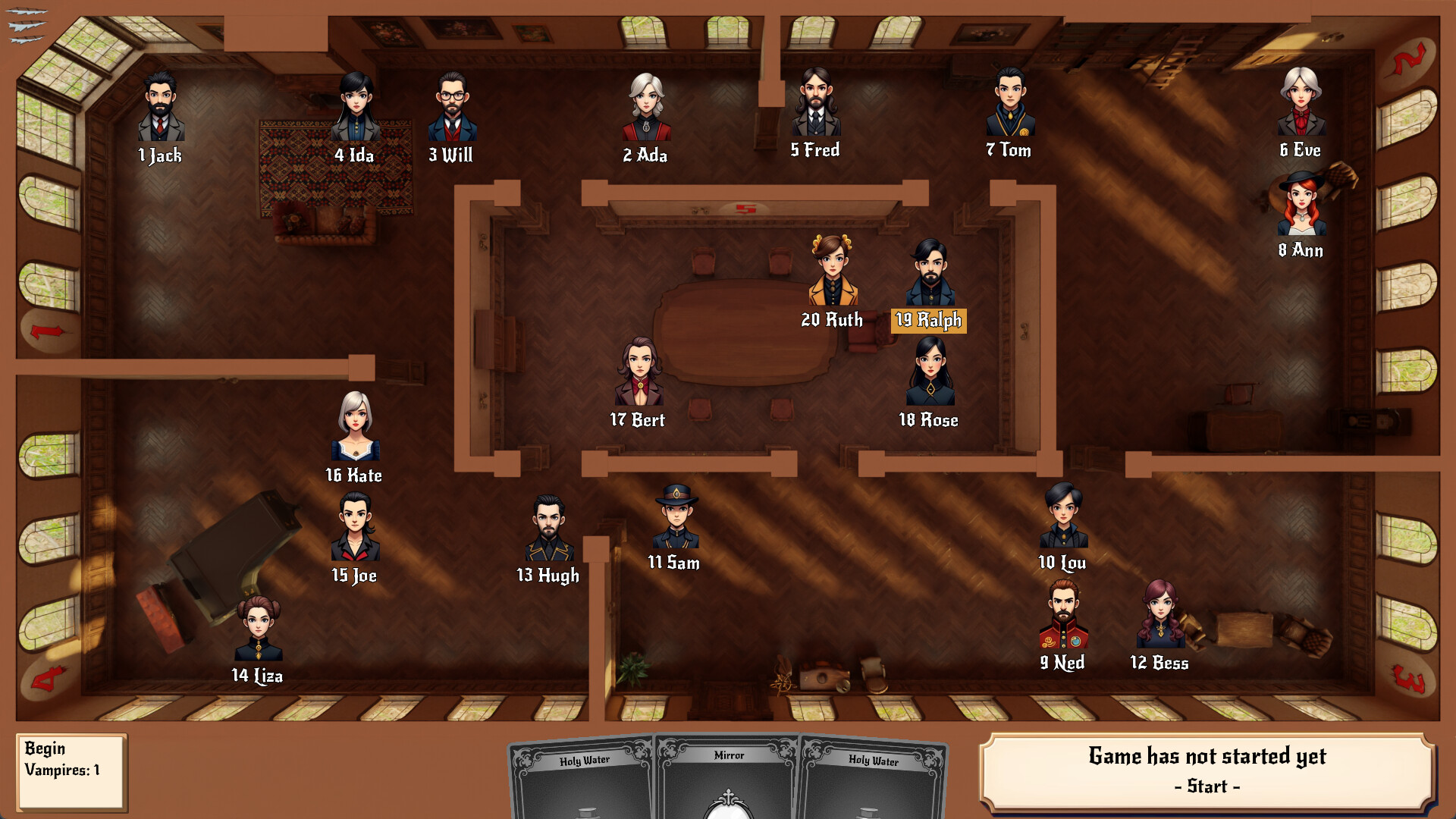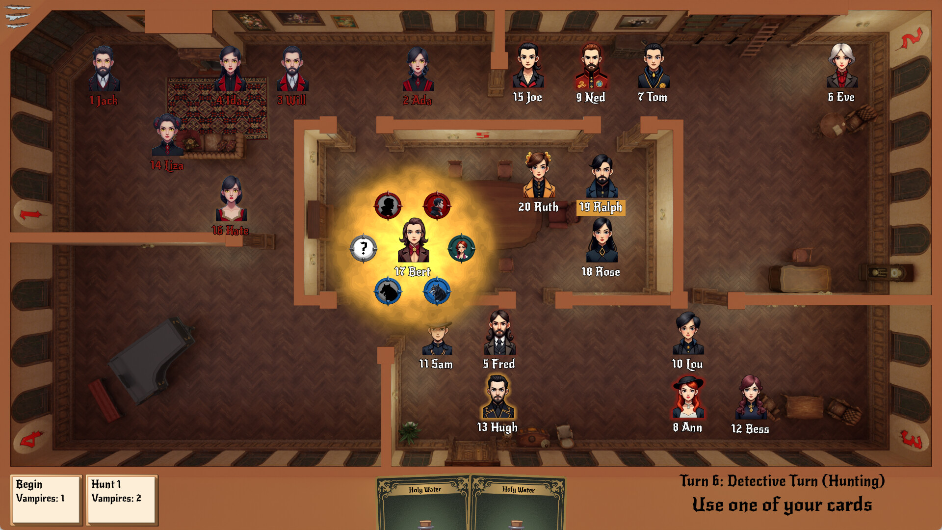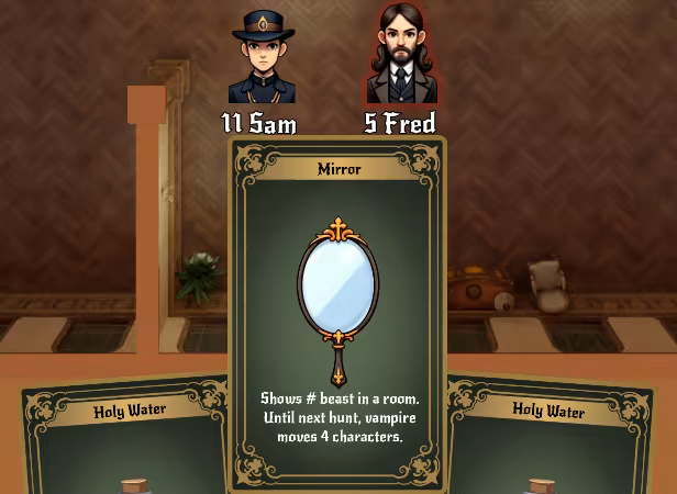 A turn-based deduction game where you play as a detective hunting vampires. Use a mirror to reveal hidden beasts and holy water to strike them down. But beware—the undead grow stronger with every attack. Outsmart the vampires… or become their next victim!