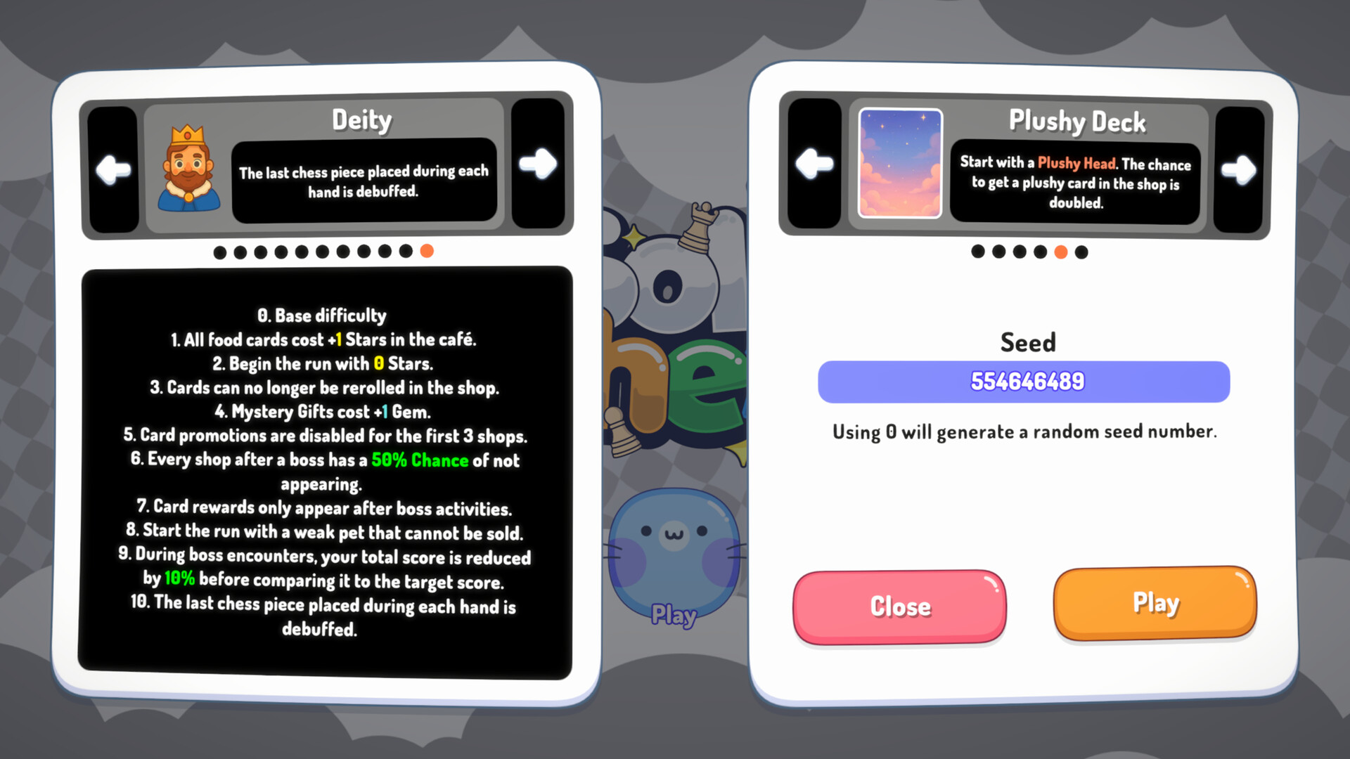 Visit a cozy café between waves to adopt pets (passive bonuses), select food (temporary buffs), or use special tools to enhance your deck.