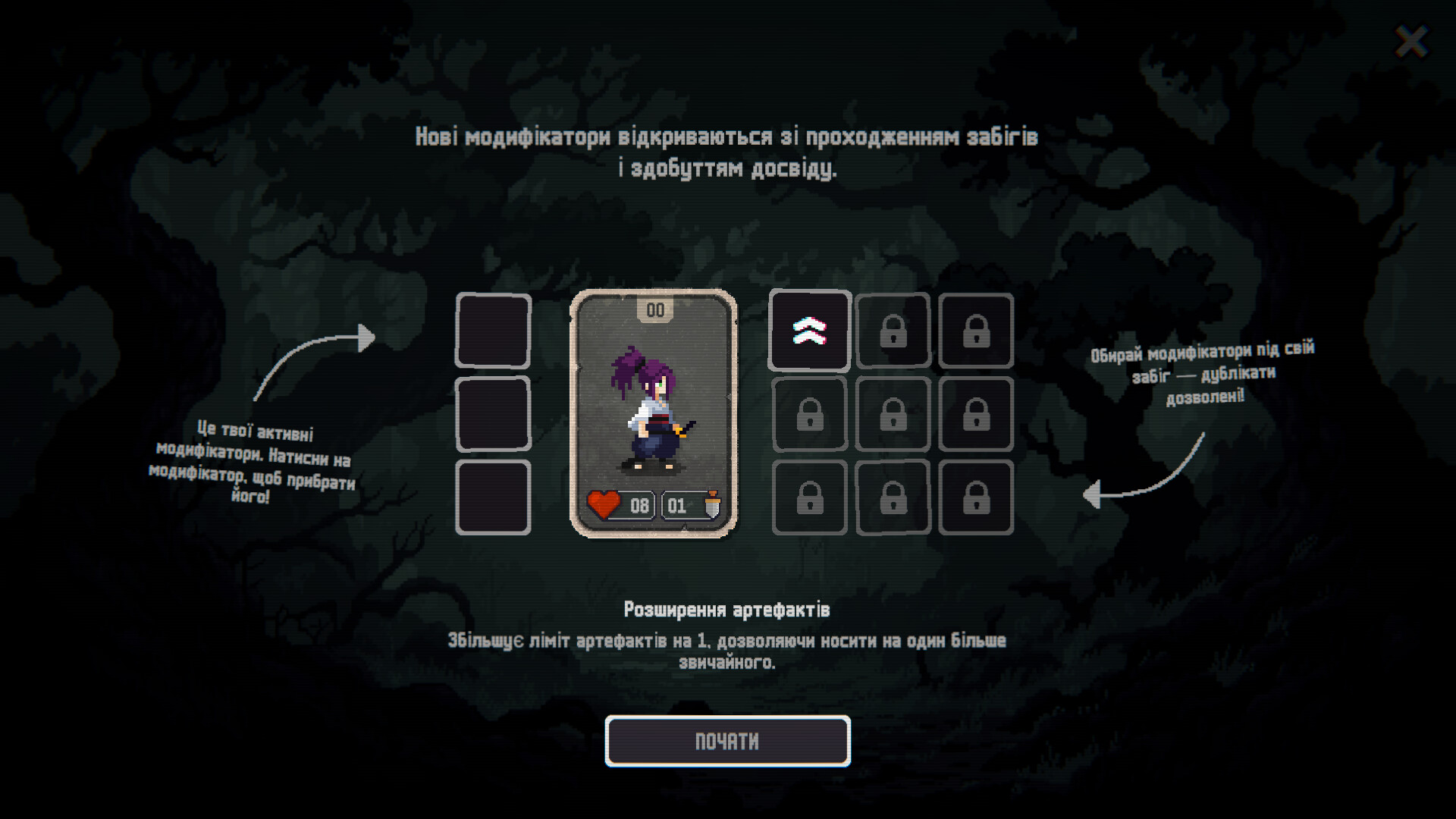 Розпочни забіг, обравши один із дев’яти модифікаторів — посилюй героя, комбінуй ефекти та відкривай нові, заробляючи очки у підземеллі. Кожен вибір наближає тебе до перемоги.