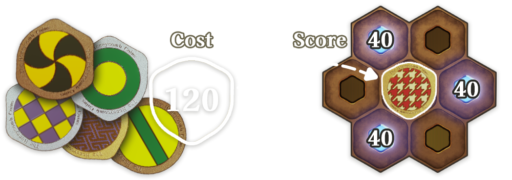 This part of the game is what makes Honeycomb Coins unique. During the attacker turn, exactly one coin must be placed. Each coin has a numerical value called Cost, which is distributed and accumulated across the surrounding board on the place you set the coin. These accumulated values are referred to as Board Score. The total of all board scores becomes the player's final score, which determines the outcome of the match.