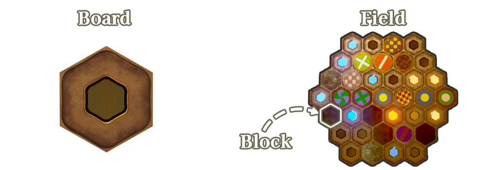 Each individual space where you place a coin is called Board. There are 37 of these boards arranged in a honeycomb pattern, forming the field. At the start of each match, 6 Blocks are randomly placed. You can’t place coins or traps on these blocked boards, and they won’t contribute to scoring either.