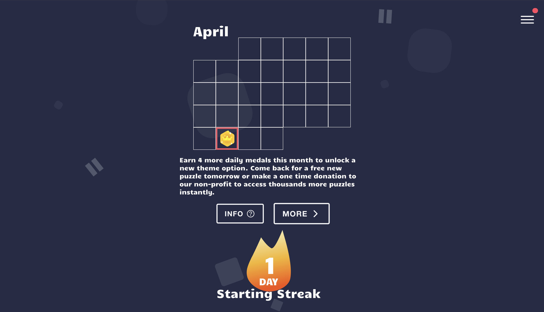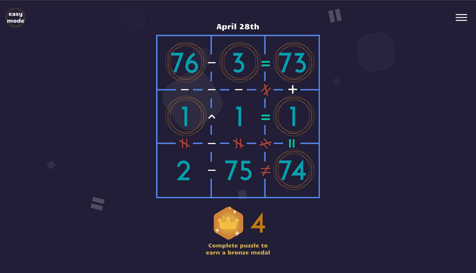 Solving the grid in fewer moves will gain a silver or gold medal, but a bronze is awarded regardless, so don't stress. The daily puzzle gives players a free way to play and unlock content. Acquire “streaks” tokens by playing regularly. Exchange medals and streaks for Challenges, packs of themed puzzles. If the squares seem too complicated, open the menu to try Snap Mode. A number will automatically be locked (circled) when in the correct place. This mode can be played in a limited number of sequences before it reverts to the default. Donate to our nonprofit for access to unlimited difficulty levels.