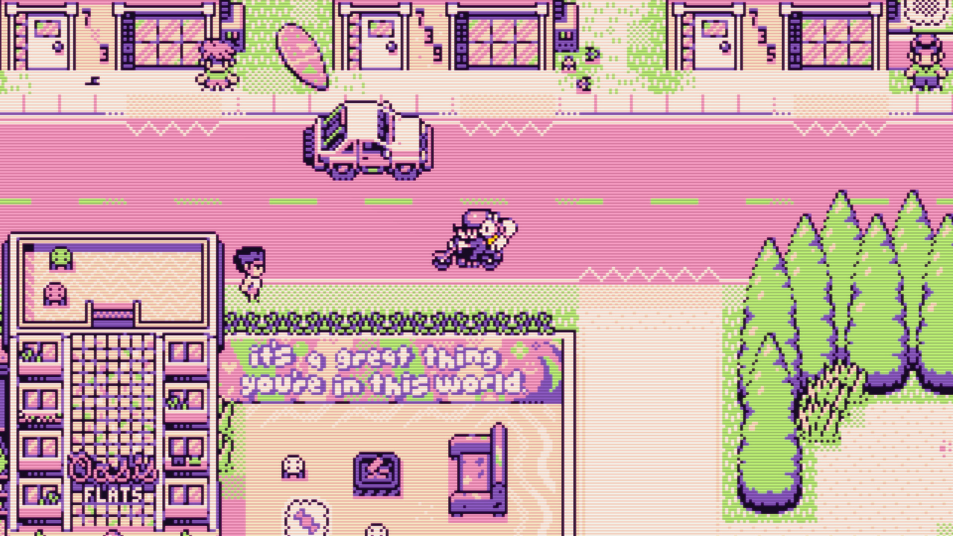 Experience the unique vibes (and colour palette) of PETAL RUNNER’S second district as you zoom through hyper-detailed pixel streets, meeting characters full of personality some may describe as “charming” or “wacky” or “wait, stop... scratch-’n-sniff stickers are not actually food!” (Your mileage may vary—you ARE riding a hand-built motorcycle, after all!)