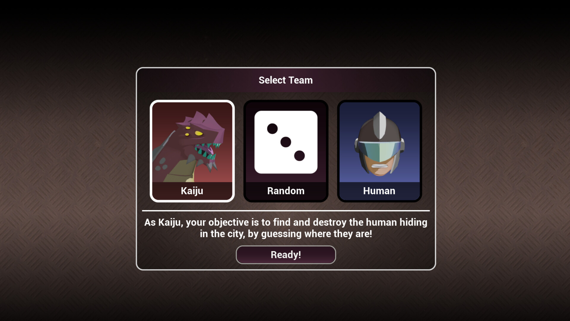 In a game of great minds and Hide-and-seek, save the city or destroy it! Play as an agent of the Earth Defense Force or a Kaiju and try to defeat your opponent before they defeat you!