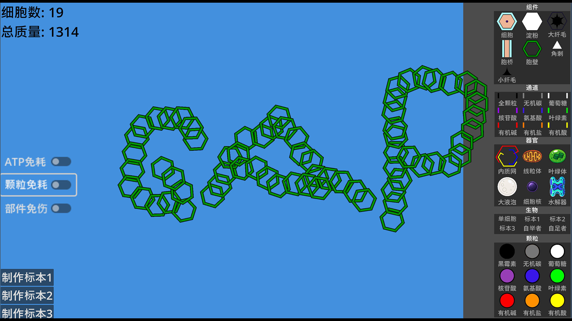 在遊戲中,所有生物皆由一個個細胞與外部組件組成,而細胞又由內質網、細胞器和蛋白質等構成。因此您可以如同堆積木一般,隨心所欲地創造出多細胞生物,並將其投入遊戲世界。您能用最少的材料創造出最優秀的生物嗎?