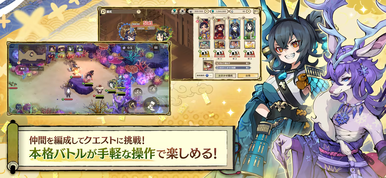 仲間を最大4人まで編成し、稲の精霊と一緒にクエストに挑戦!