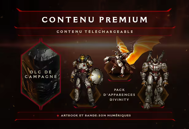 L’heure du combat est arrivée avec la Mise à niveau Premium*, comprenant le DLC de campagne**, l’artbook et la bande-son numériques ainsi que le pack d’apparences Divinity, qui comprend des apparences assorties pour le DOOM Slayer, le dragon et l’Atlan.