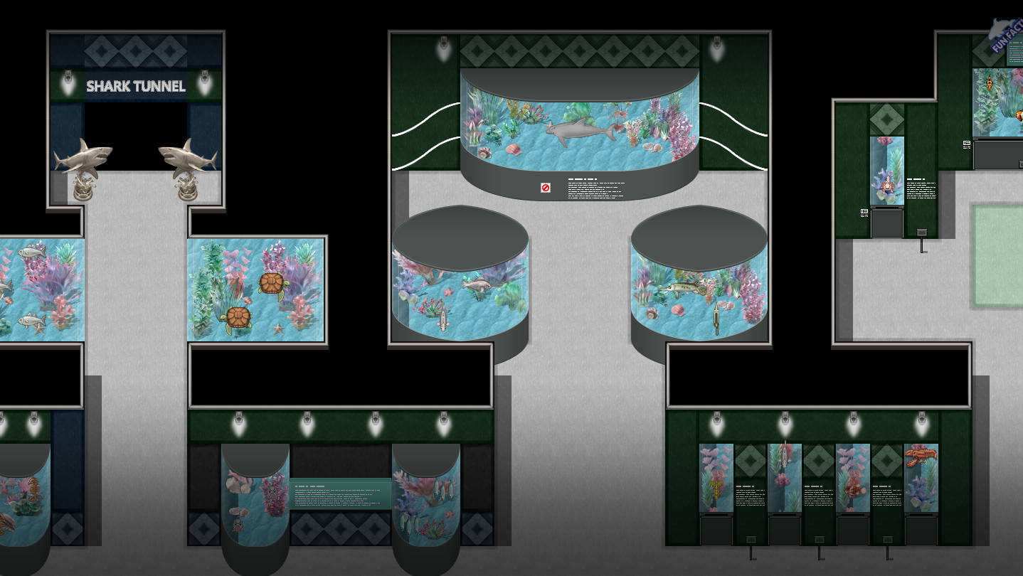 Give your heroes a chance to unwind and enjoy watching fish swim by with the KR Aquarium Tileset! Kokoro Reflections is back with another modern set of tiles designed for MV and MZ, this time focusing on all the objects you could need to build an indoor aquarium. A1, A2, A3, A4, and 4 B sheets are filled with a variety of walls and floors to help you build rooms where the focal points shine: the huge tanks of water! Layer the tank tiles over the water A1 tiles to create coral-filled aquariums with subtle movements that are wonderful backdrops for the animals. Mark important information with signs written on the walls and large arrows guiding your heroes around the space, and add a unique item shop to your game with a gift shop filled with cloth armor and buff-giving plushies!