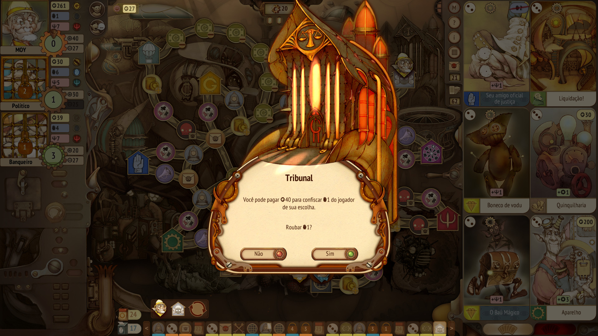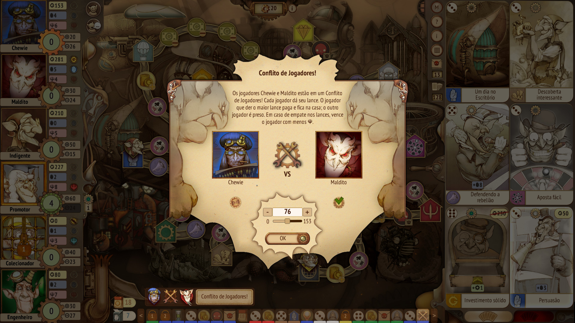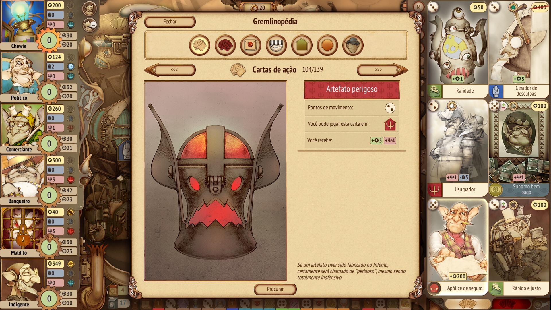 “Um jogo de tabuleiro digital, inteligente e bem implementado, que envolve ganhar dinheiro e prejudicar os adversários em uma distopia gremlin steampunk.”
