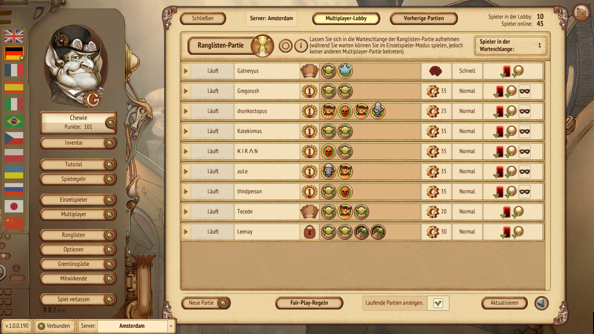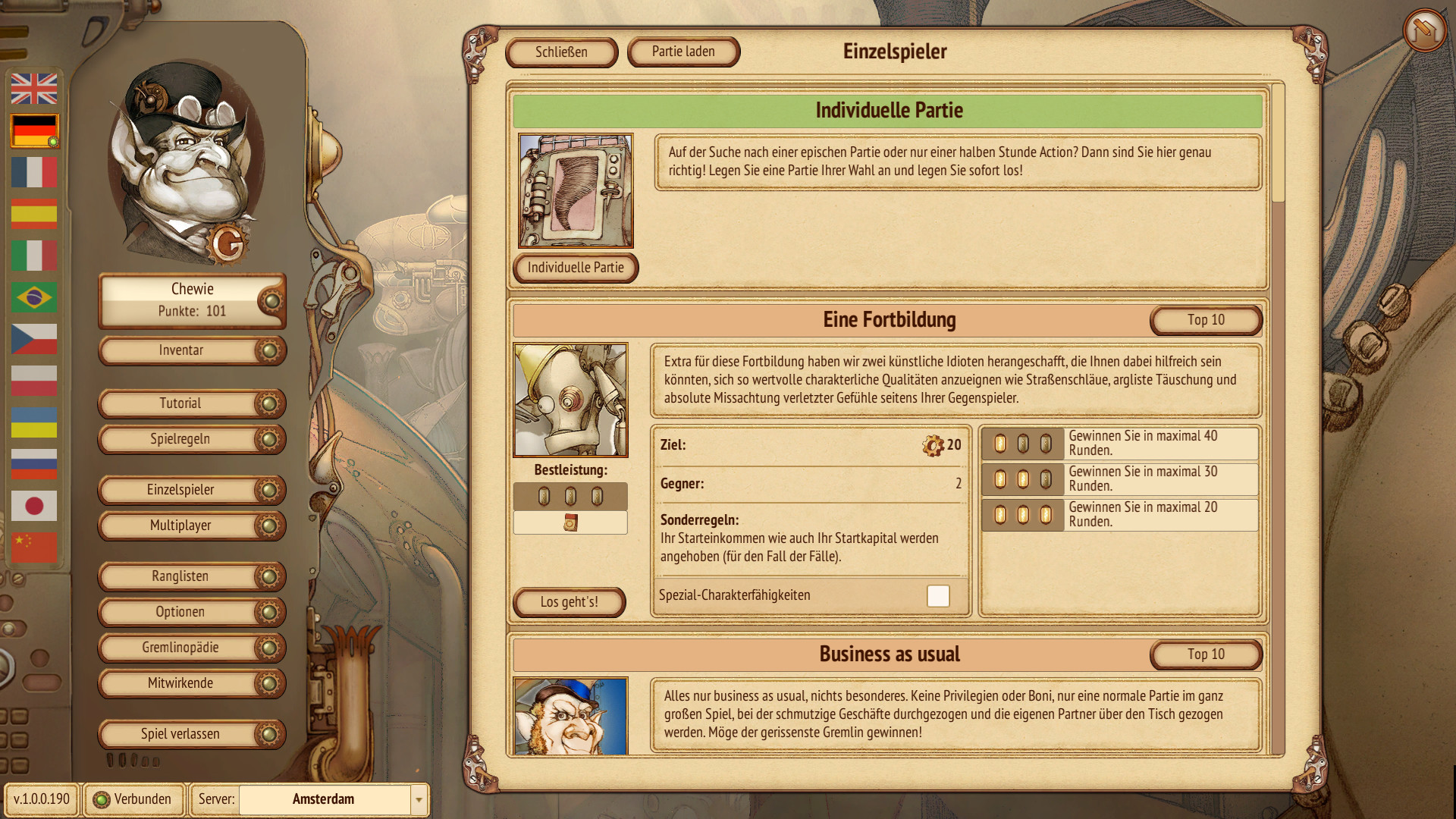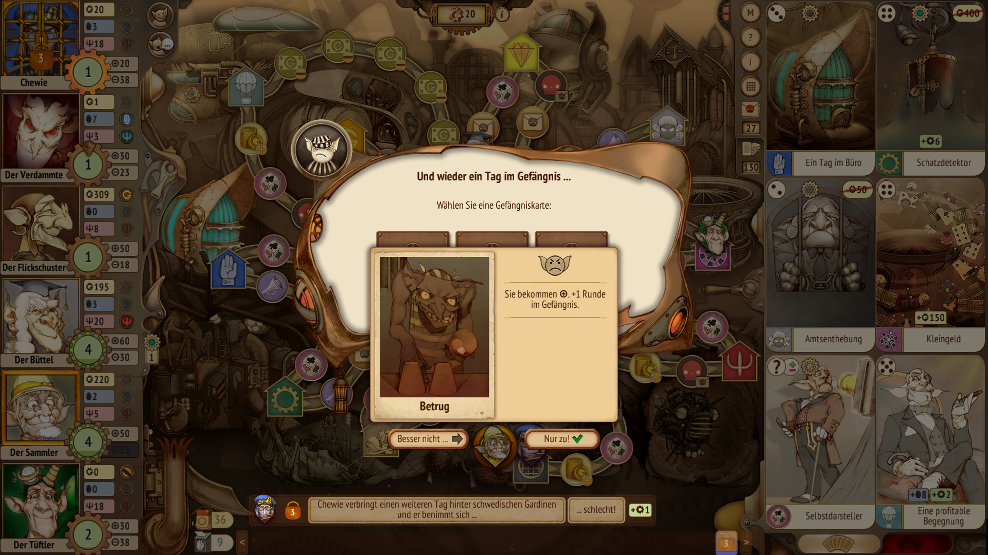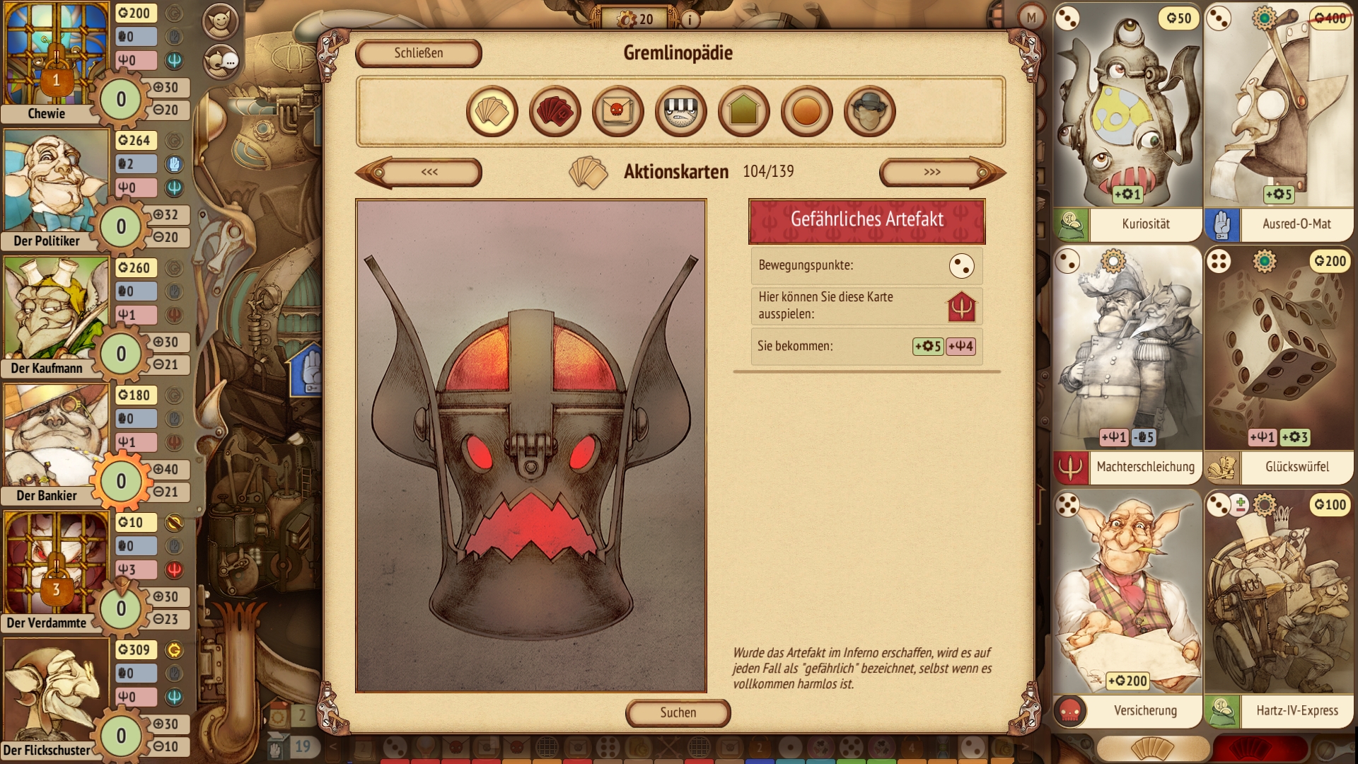 Dies ist ein Brettspiel für Strategen in einer Steampunk-Welt voller Gremlins. Sparen und investieren, stehlen und erpressen, verhaften lassen und verhaftet werden – in Einzelspieler- und Multiplayer-Modi, mit Rang- und Bestenlisten sowie Team- und Zuschauer-Modus.