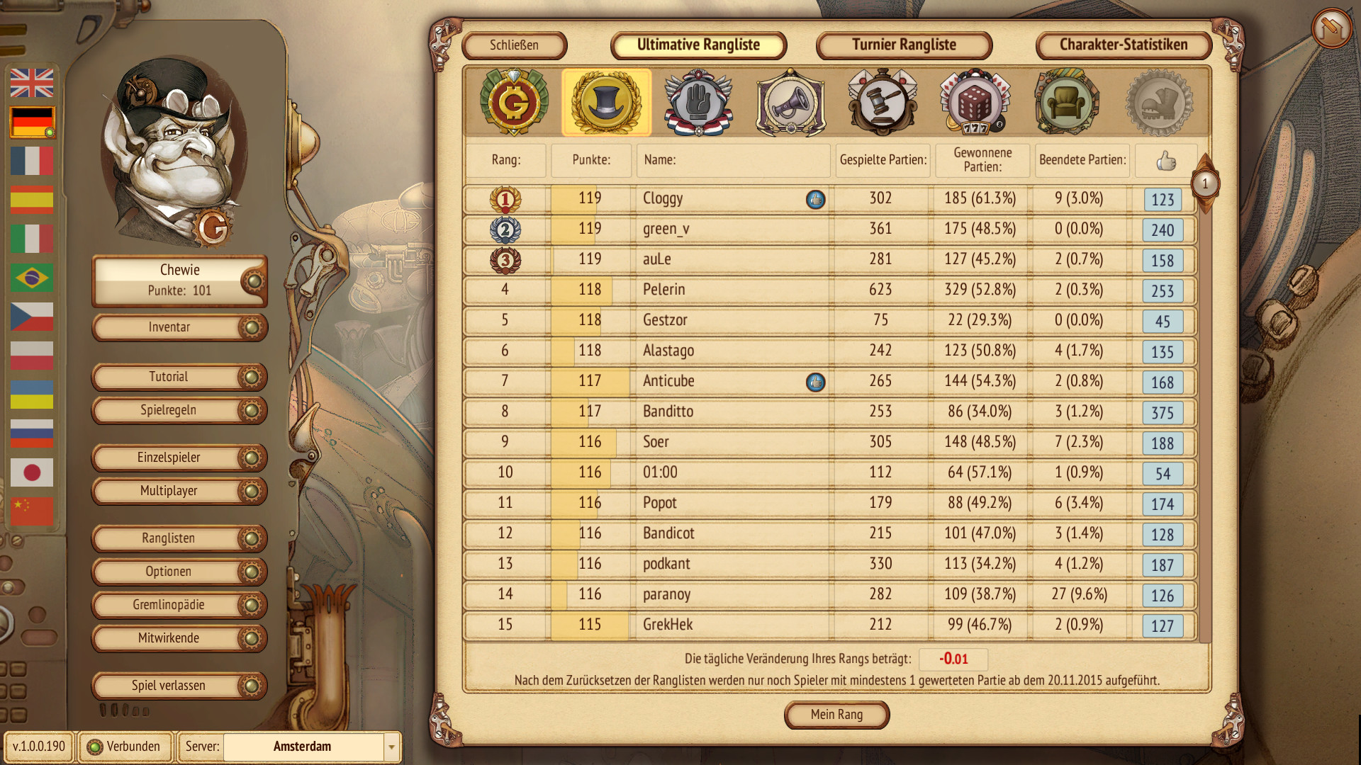 • Der Multiplayer-Modus des Spiels bietet ein System aus Bewertungen, Bestenlisten und Ranglisten-Partien: treten Sie in einer bestimmten Liga an und nehmen Sie an den regelmäßig stattfindenden Turnieren mit über 1.000 Spielern teil. Ein System aus anonymen Masken sorgt dafür, dass bei Ranglisten-Partien alle zu den gleichen Bedingungen spielen.