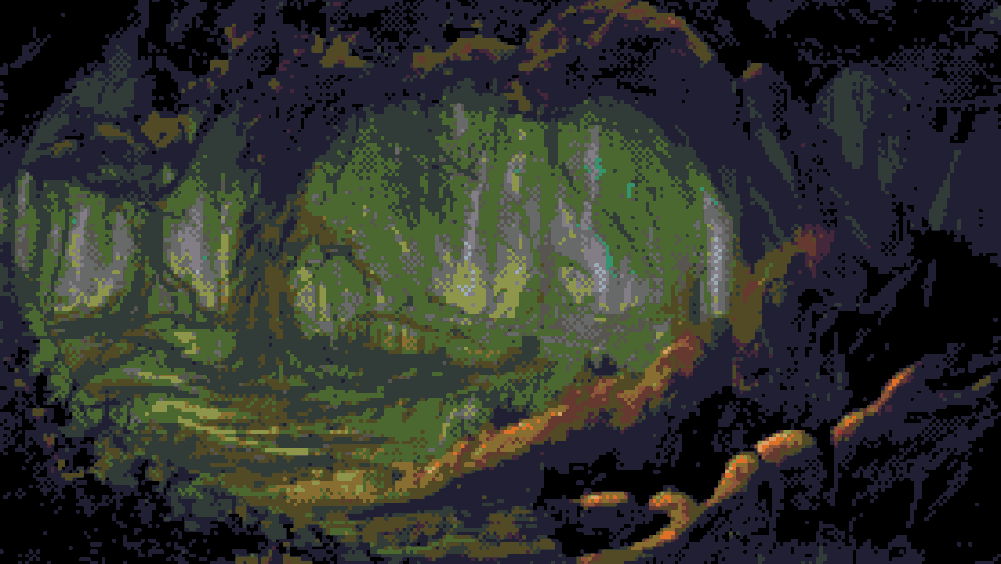 The game includes dozens of hand pixeled backgrounds to represent each area in the game. There is an "Immersive Backgrounds" setting option that allows you to toggle between having the full size pixel art backgrounds on, or just having a clean and simple black background.