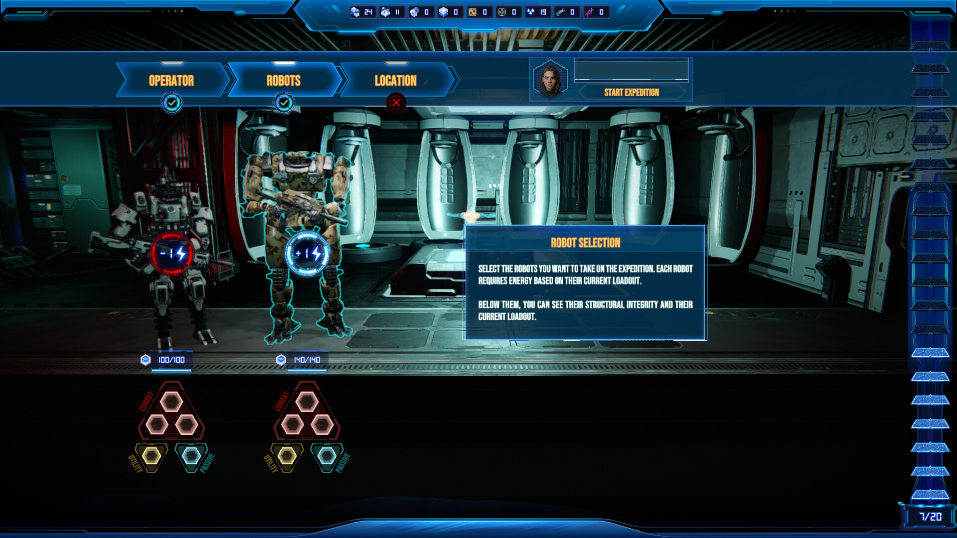 At night, you embark on real-time expeditions. Before leaving the base, you choose one of your characters as the Robot Operator and assemble a team of robots for the mission.