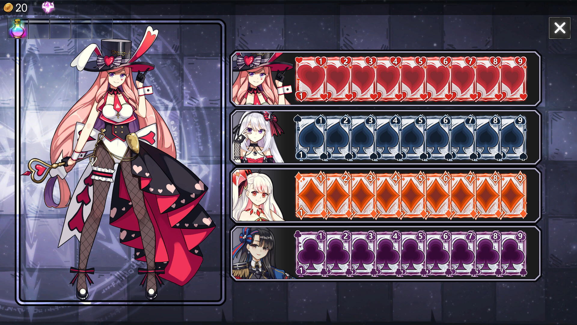 This game's combat system employs a non-traditional turn-based approach, where enemies have a countdown timer. Each time you play a card, the enemy's countdown is reduced by 1. When the enemy's countdown reaches zero, it will launch an attack against you. During combat, you can select up to 5 cards to attack the enemy at a time. The total damage caused by each attack is determined by multiplying the sum of the points on the cards by the card type multiplier and then by the level. Combined with the skill effects attached to each card, making reasonable choices ensures that each attack is unique.