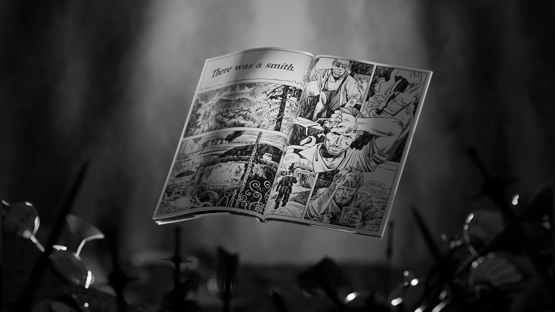 A dark reimagining of the game’s events in a stark black-and-white comic format.