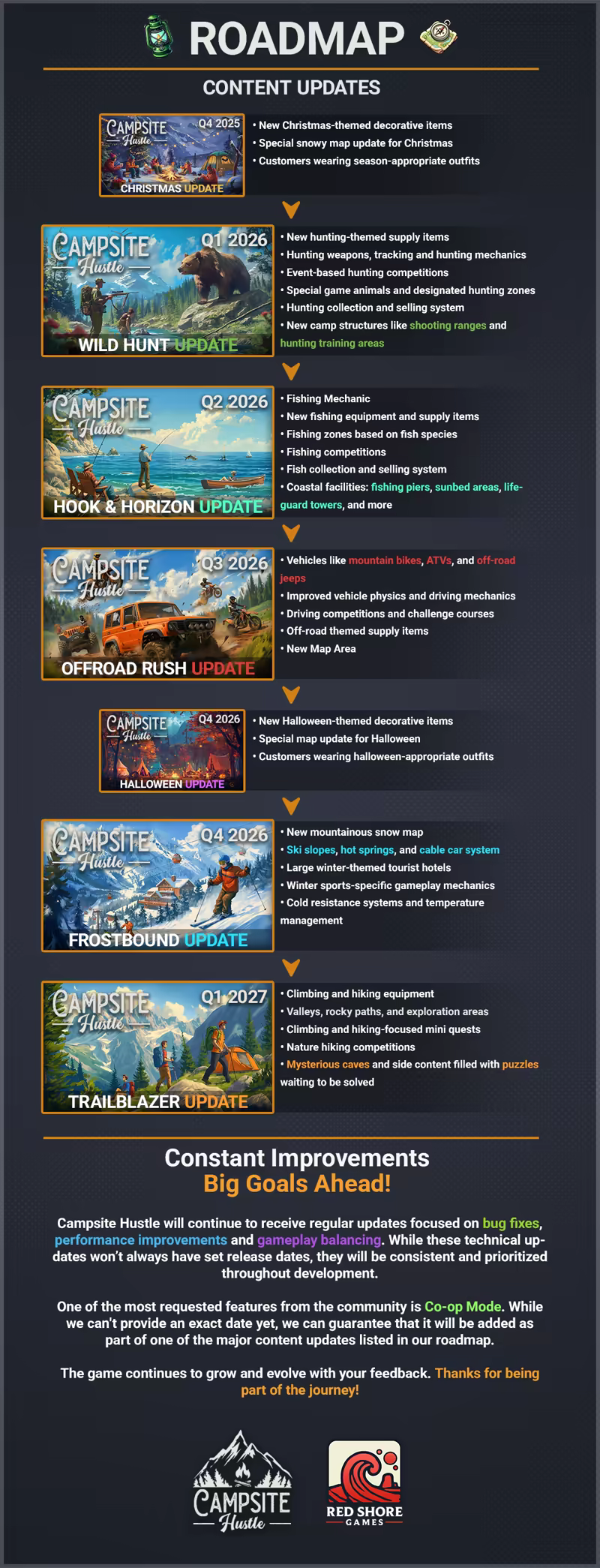 “Campsite Hustle is expected to stay in Early Access for about 1 to 1.5 years. During this time, we’ll refine core systems, add new content, and balance gameplay based on player feedback. More features, buildings, and customization options are planned for both the store and campground. We’ll move to full release only when the game feels truly ready quality over schedule.”