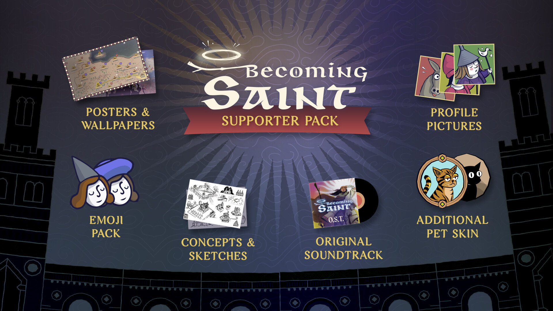 Note: The game soundtrack, Social Media Profile Picture, Posters & Wallpapers, Emoji Pack & Concept Art & Sketches will be directly downloaded at the root of your Becoming Saint game folder. Access your local folder of the game to get the files once you've purchased this supporter pack.