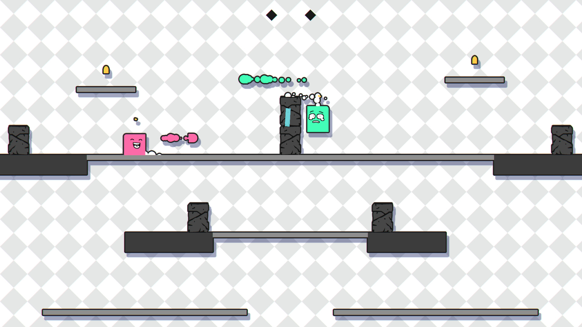 Neben Verbesserungskarten können auch solche gezogen werden, die deine/n Gegenspieler/In schwächen. Lass ihn mit der "Pogo Stick"-Karte unkontrolliert springen oder mach ihn größer, damit er leichter zu treffen ist!