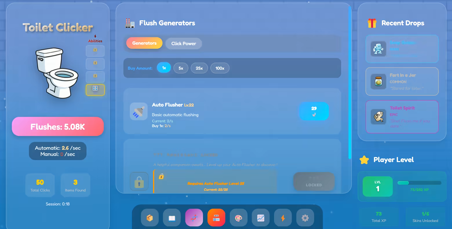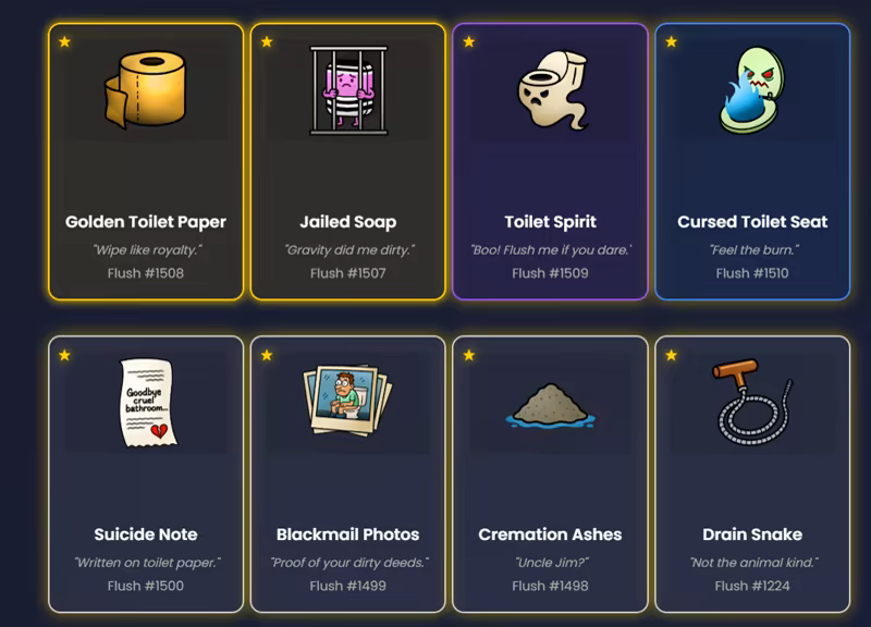 A hilariously absurd idle clicker where you flush toilets to collect bizarre items, and build the ultimate toilet collection with community-voted additions.