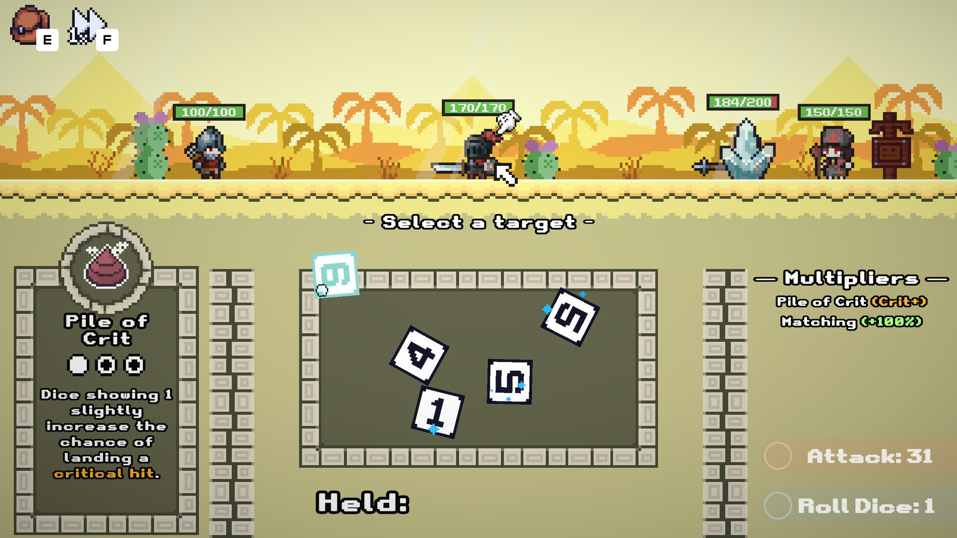 Crit Happens! is a dice-building, turn-based roguelike where you roll your dice to attack! The higher your roll, the more damage you'll deal with your attacks. You can roll your dice at least 3 times, and hold the dice you're happy with. It's up to you to balance risk vs reward.