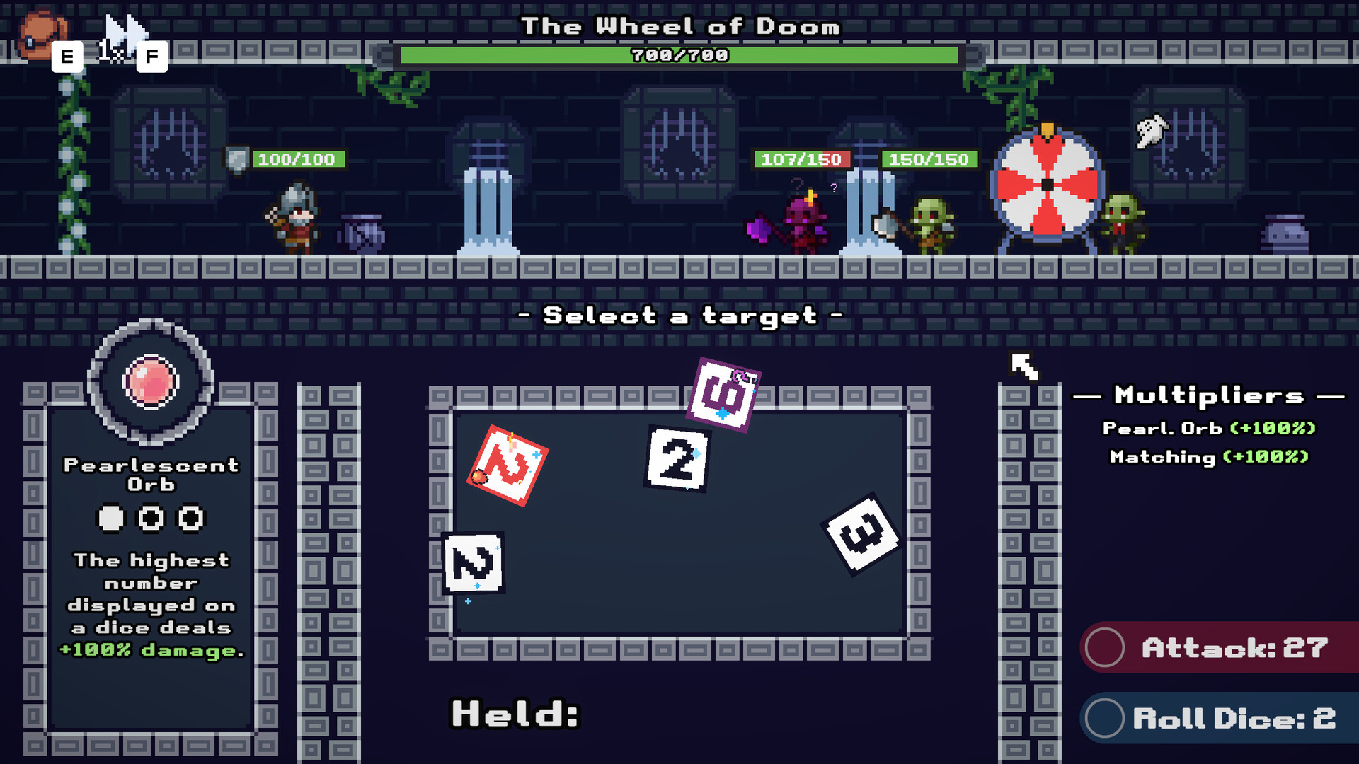 A turn-based roguelike where every attack is decided by a roll of the dice - Know when to roll and when to hold to increase your attack and defeat powerful enemies. Craft your dice and seek out magical trinkets and powerful relics that will change the way you play!