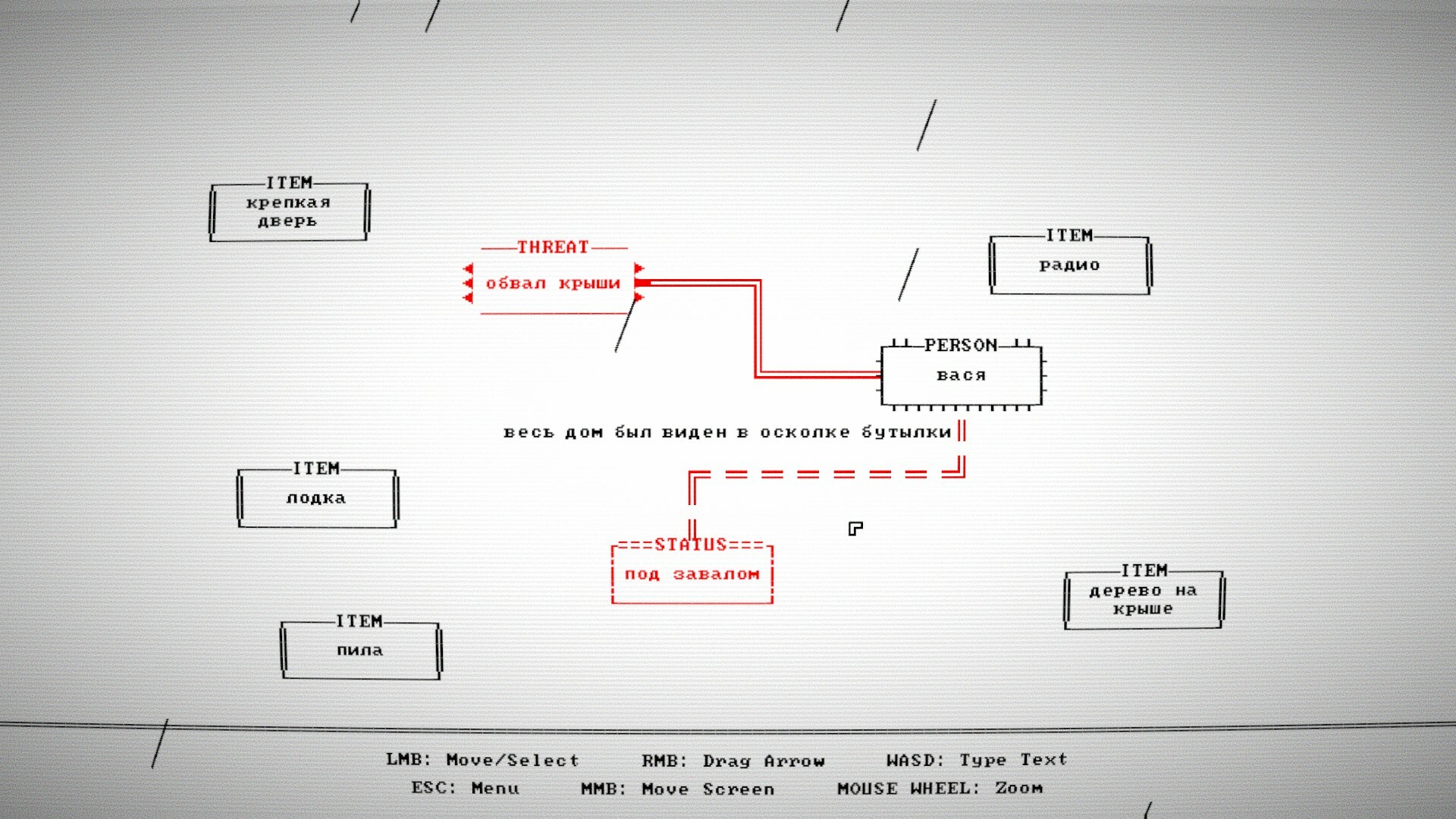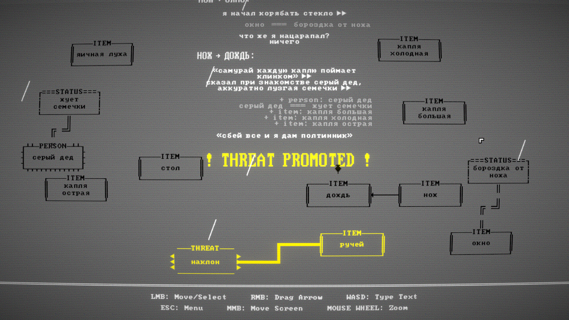 A text-based sandbox PC game about exploring the world through short phrases in the terminal. The player roams through events, acquires new items, locations, facts, or acquaintances, and combines them to unlock new events.