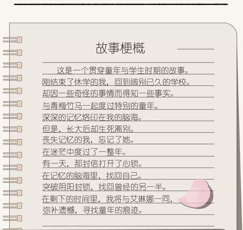 这是一个贯穿童年与学生时期的故事。「结束了休学的我,回到阔别已久的学校。 却因一些奇怪的事情而得知一些事实 」。与故事的女主人公艾琳娜一起,续写美好记忆。
