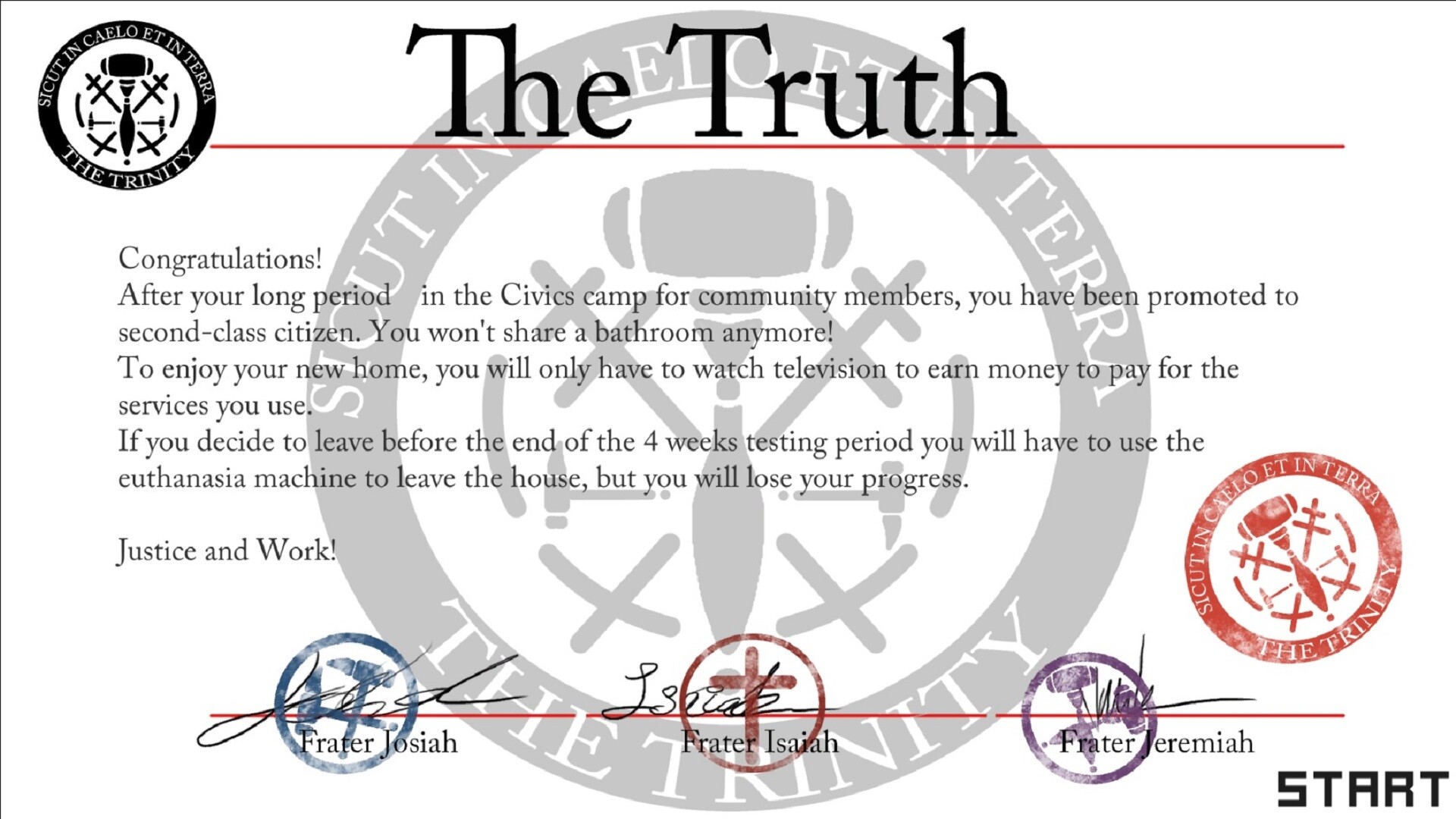 Grâce aux diffusions gouvernementales quotidiennes, les citoyens seront informés de l’évolution de la société et recevront de nouveaux objets sur lesquels dépenser leur salaire. Ils peuvent mener une existence confortable — ou risquer de briser les règles et d’en subir les conséquences. Mais qui a dit que la connaissance était gratuite ?