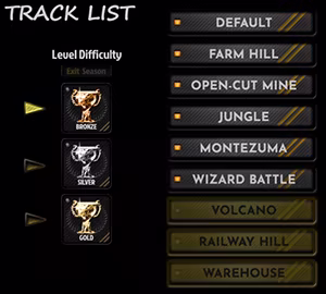 There are 3 levels of difficulty, and 9 tracks (New track added, Wizard Battle @ 24/02/2026 & Montezuma @ 17/06/2025) to play and unlock. Do note, Gold level will require all your nous, reflexes and ability to drive competently. Or, better yet, 'recklessly, aggressively stupid and diabolically evil'. Draw no quarter, win at any cost!