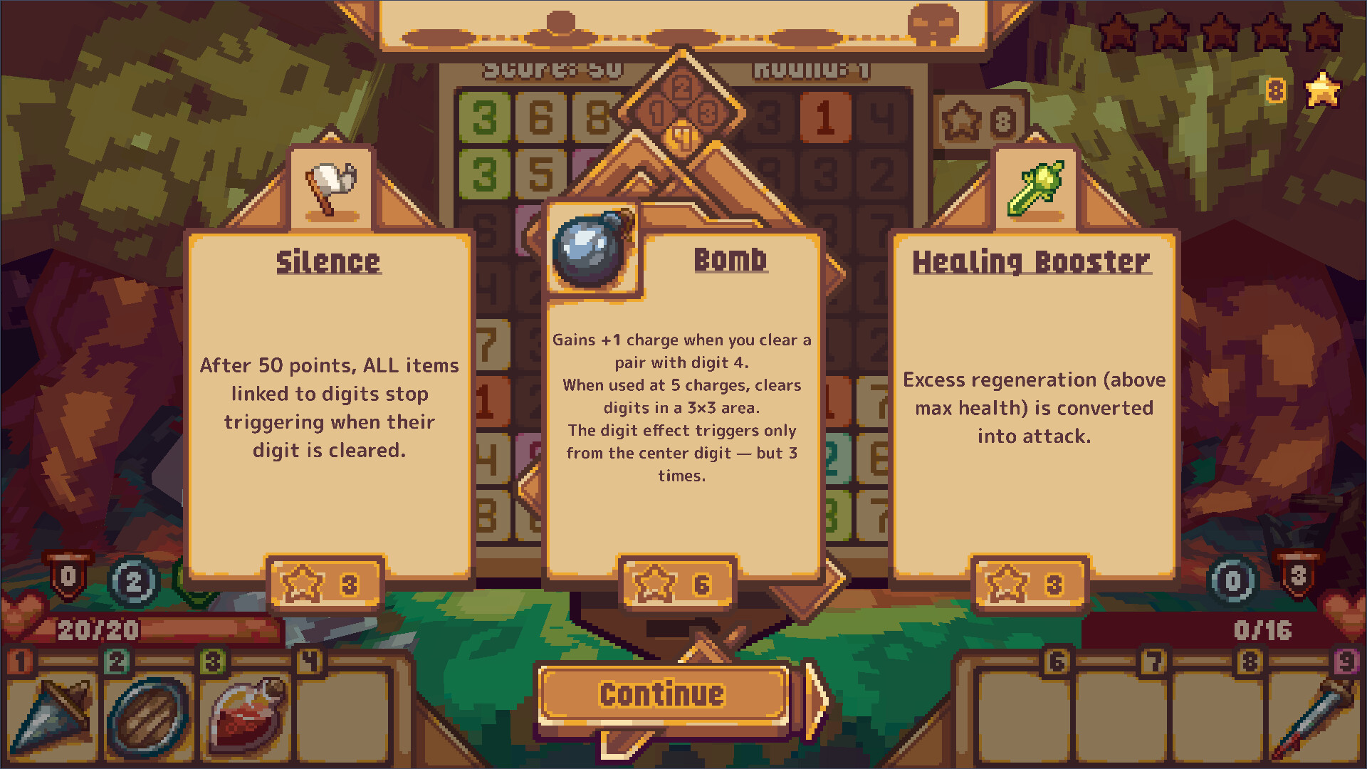 Use the number grid to perform actions — find matching pairs or pairs that add up to 10. Every valid pair lets you attack, heal, defend, or trigger powerful special effects.
