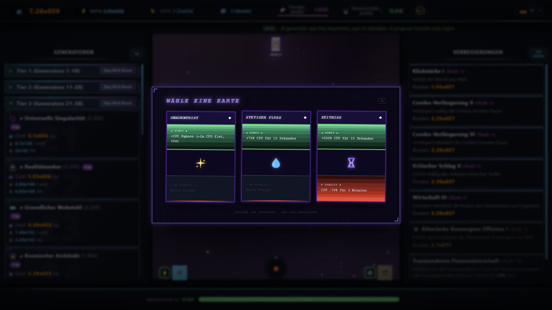 Sobald deine Produktion astronomische Level erreicht, ist es Zeit für einen Reset – und eine Evolution. Durch das Prestige-System opferst du kurzfristigen Fortschritt, um Prestige-Punkte (PP) zu erhalten und permanente Upgrades freizuschalten: