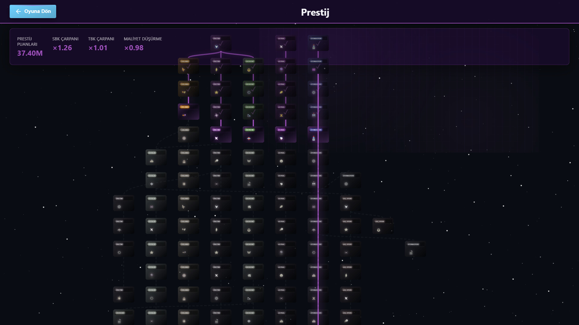 Üretiminiz astronomik sevijelere ulaştığında, sıfırlama — ve evrimleşme zamanı gelmiş demektir. Prestij Sistemi sayesinde, kısa vadeli ilerlemeyi feda ederek Prestij Puanları (PP) kazanın ve kalıcı yükseltmelerin kilidini açın: