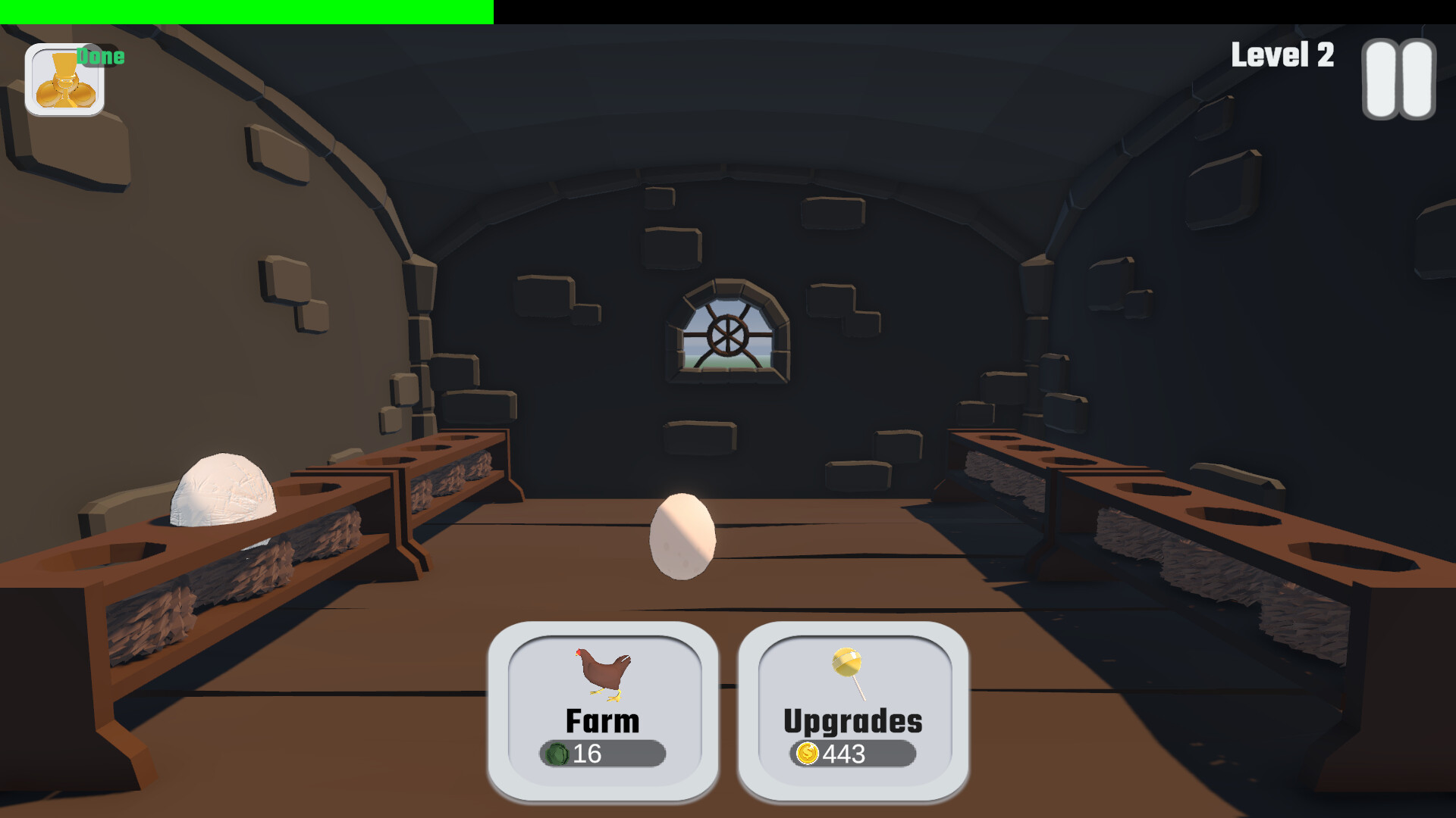 Buy upgrades to automate your farm and hatch eggs automatically. Chickens can be upgraded to deal with farm production.