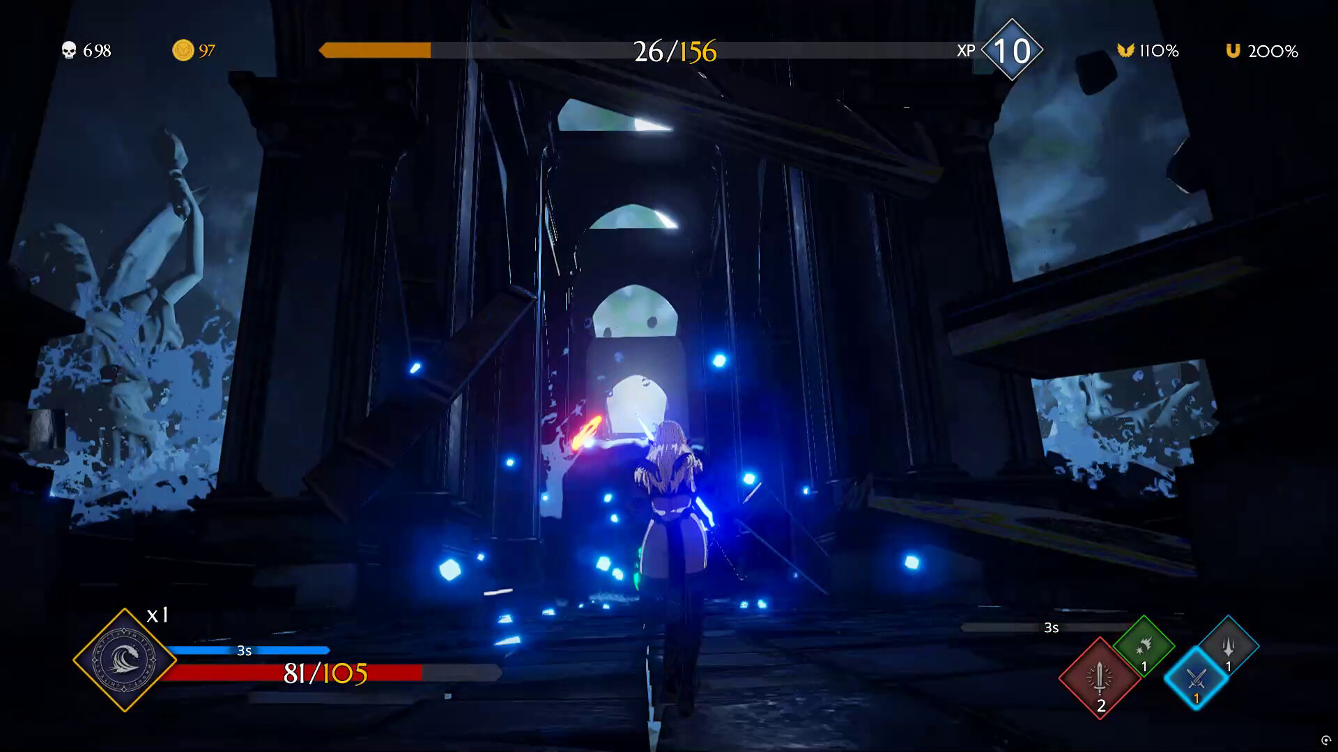 • Forward Melee Lunge: precise close-range strike to finish high-HP enemies before they exit—and, with perfect timing, to parry boss dash attacks.