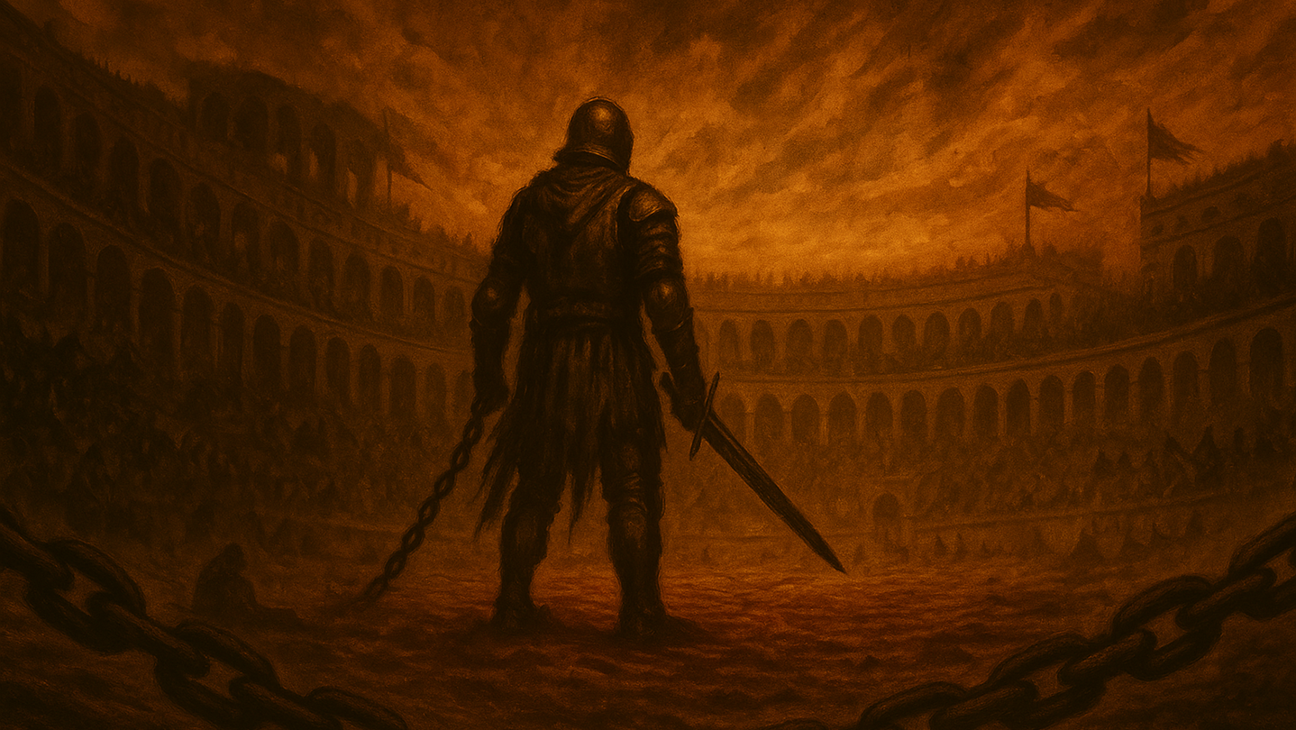 Themes include forced combat for survival (“bonded fighters”) and player-driven moral choices like sparing or executing defeated opponents.