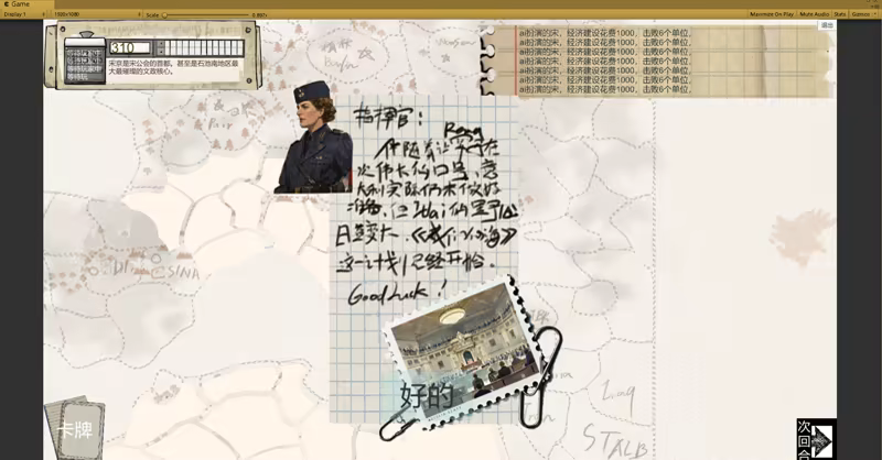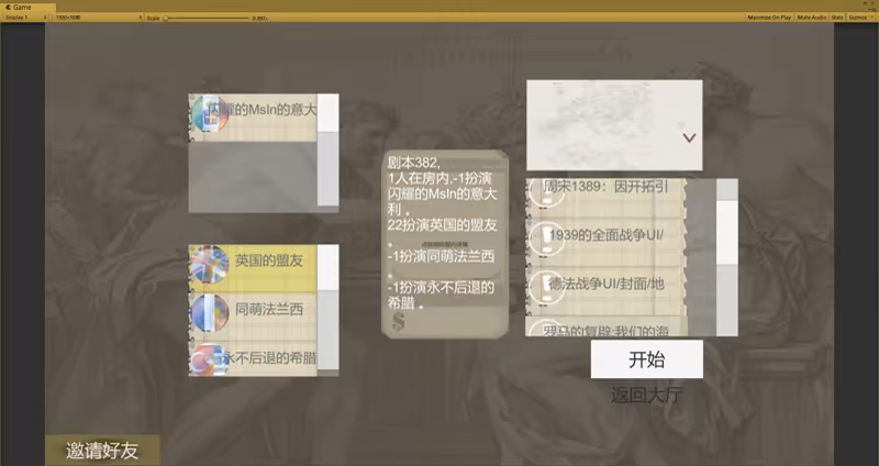 一款回合制策略二战游戏。 游戏故事灵感欧洲二战。 《剧本儿》目前有原创1v1地图,3v51939地图,1v3地中海,1v1德法地图(还有什么想玩的地图或者故事剧情可以联系我们。)。 由于服务器支持联机功能,叫自己的朋友在房间大厅里等待自己,《房间号》为房主的账号。 第一个界面《登录》最初进入的登录和注册界面是需要从服务器访问数据库的。 第二个界面《房间》是寻找房间或者创建一个房间。房间一旦开始游戏就自动上锁,更好的方便一个人玩。 第三个界面《桌子》是地图游戏主要场景。