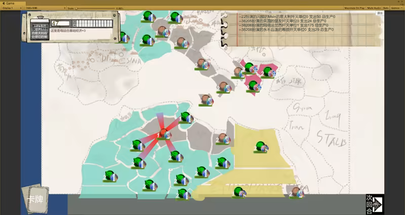 玩家进入到游戏关卡的时候,可以通过点击士兵来移动士兵占领别国的地块,建筑防御或加经济的建筑,然后点击次回合。