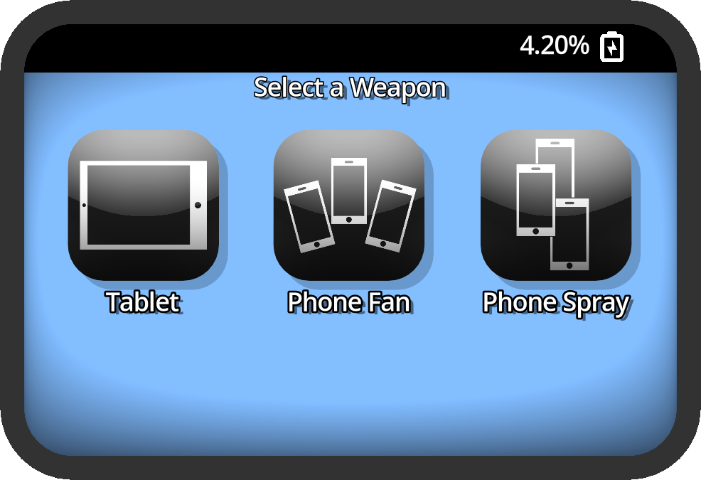 Zoomers have a choice between three weapons. Prefer the long range? Use the slow firing but heavy hitting tablet. More of a medium range player? The spray of phones has you covered. Prefer to blast the Boomers yourself, close and personal? The fan of phones fits your style perfectly.