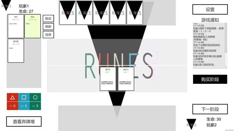 This is the digital demo version of the Rune tabletop game, a two-player battle game with deck-building elements. It supports both hotseat mode and online multiplayer. Players start with three basic runes of different shapes,.
