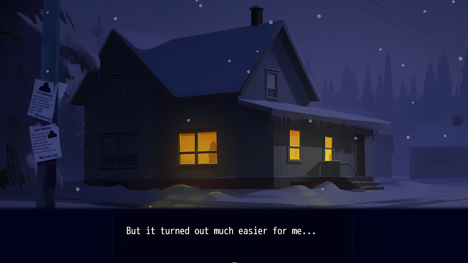 This is a demo version of the game. Dive into the snowy town's atmosphere, meet the main characters, and explore the core mechanics. Make your first meaningful choices and feel their impact on the story. Character expressions are limited in the demo, but the full game will offer a wider and more varied range.