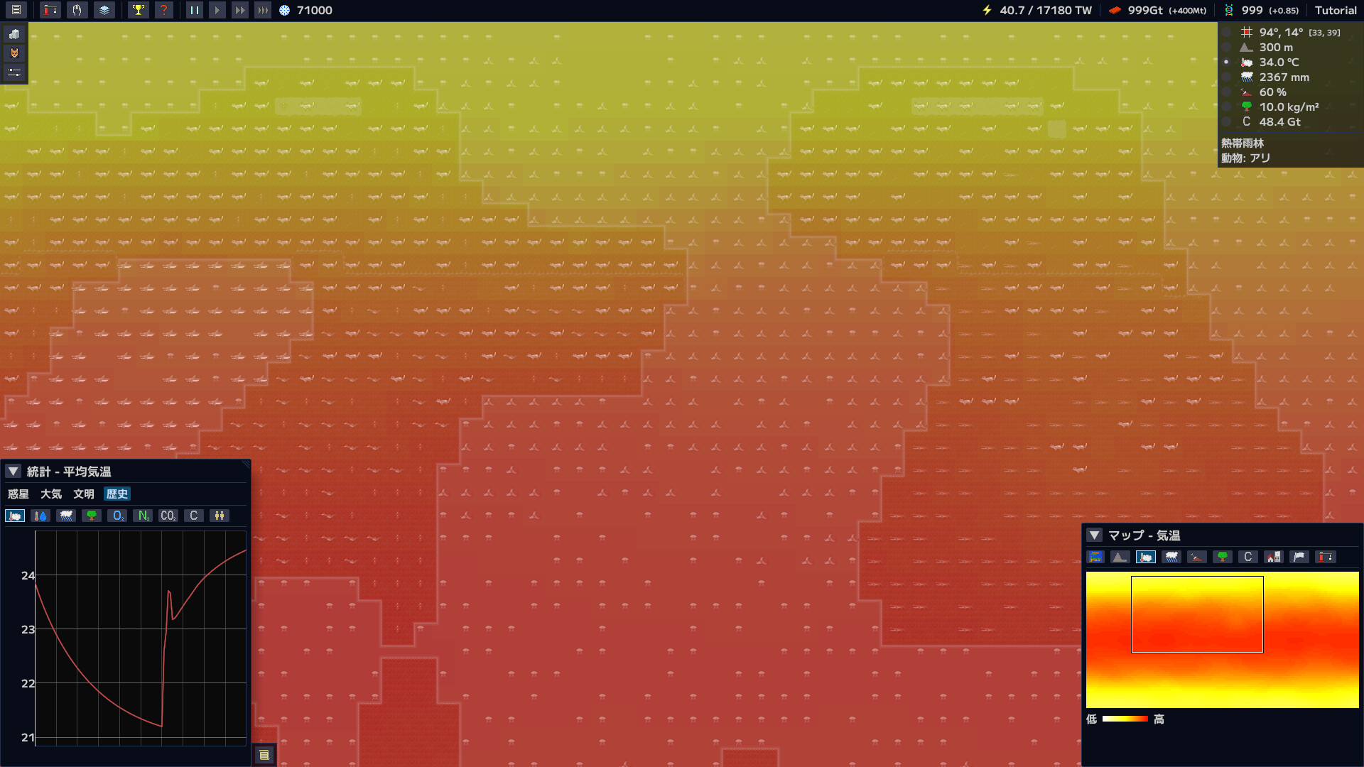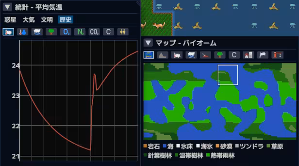 惑星全体の日照、気温、大気組成、炭素循環といったさまざまな要素が、現実の物理学と地学に基づいてダイナミックにシミュレーションされます。惑星に対して行ったプレイヤーのあらゆる行動が、惑星のあらゆる状態に影響を及ぼします。