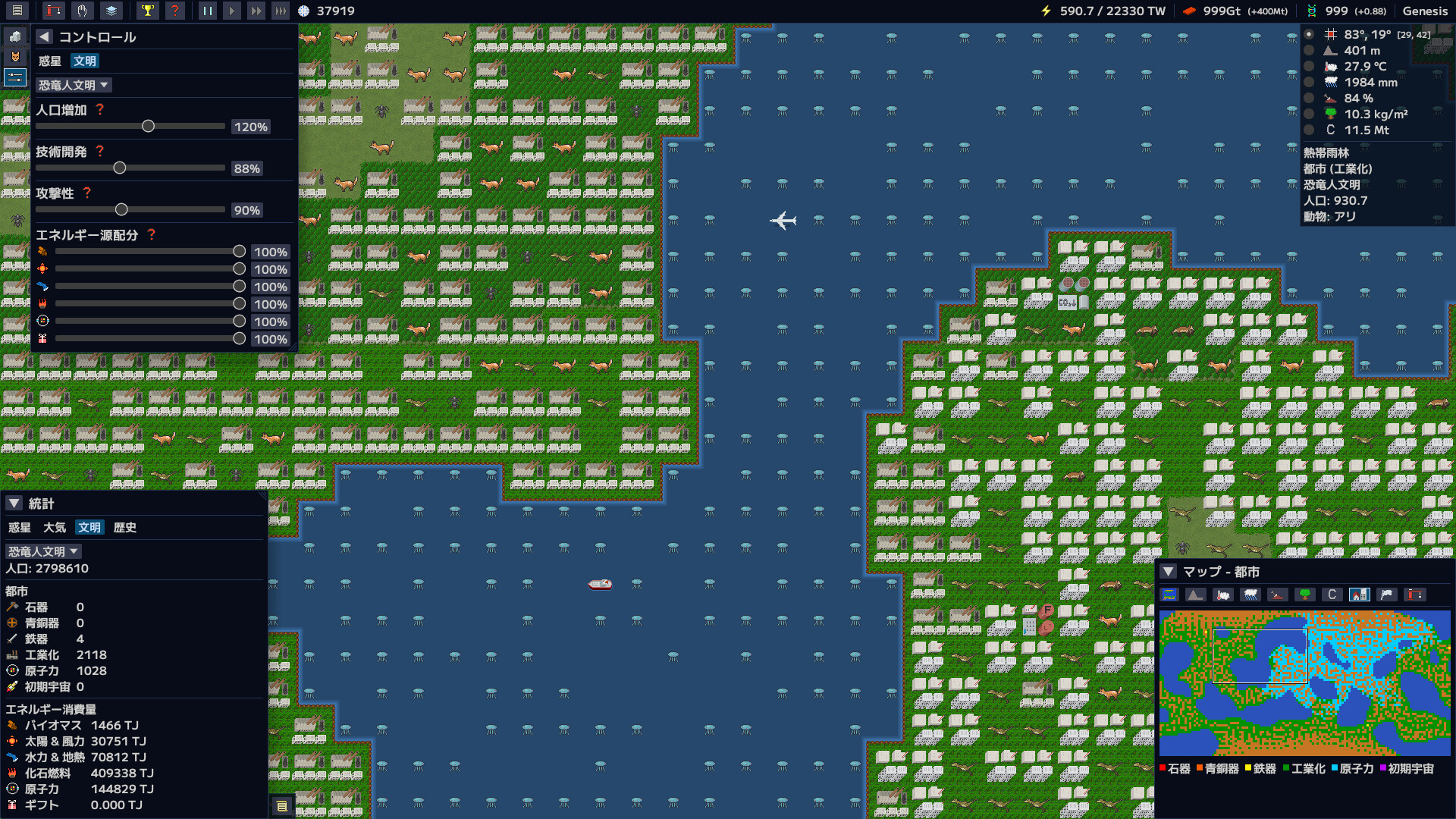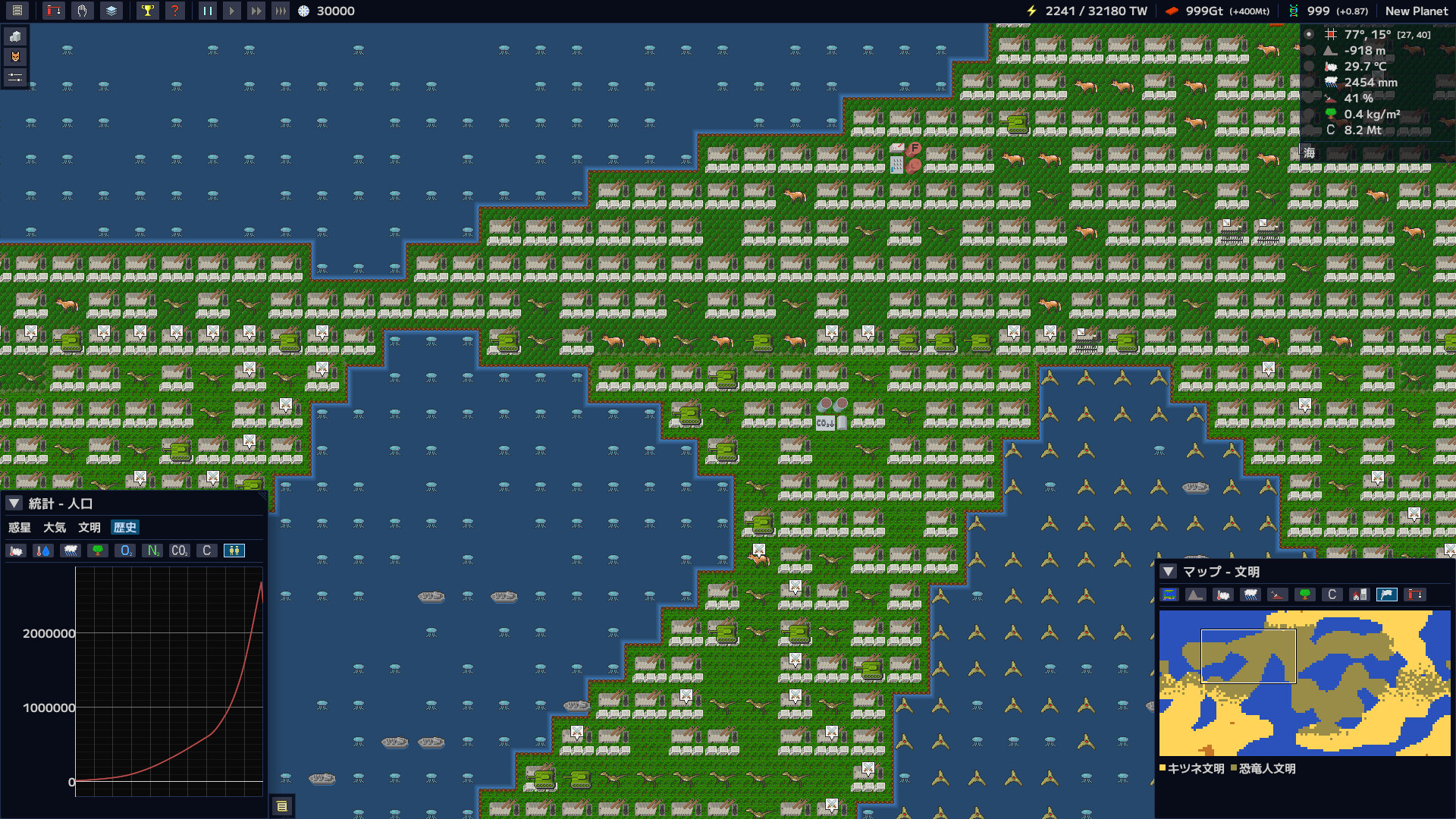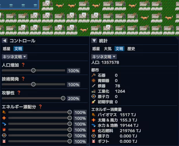 文明の発展や戦争、衰退、そしてエネルギー消費や惑星への影響も緻密にシミュレーションされます。文明は石器時代からスタートし、核融合を実用化する技術を得るまで進歩します。プレイヤーは文明の人口増加やエネルギー消費にも干渉でき、これらのパラメータを調整することで文明の変化を観察することもできます。