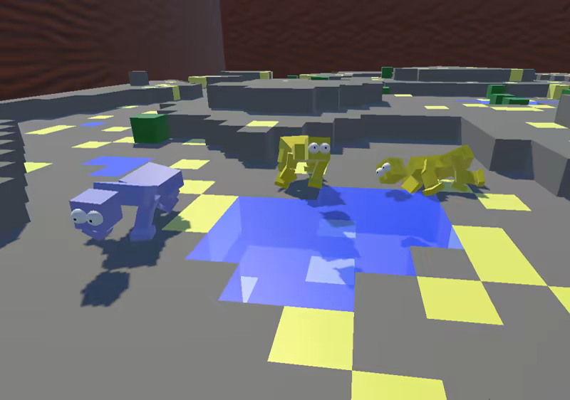 The animals are real AI robots running directly on your computer. They are controlled by classic neural networks and other types of AI such as non-axiomatic reasoning system. They have a simple form of vision sense, touch sensation, and internal sensations, and they can move each individual  body segment. They can eat, mate, and fight, all while learning and evolving in a sandbox voxel environment.