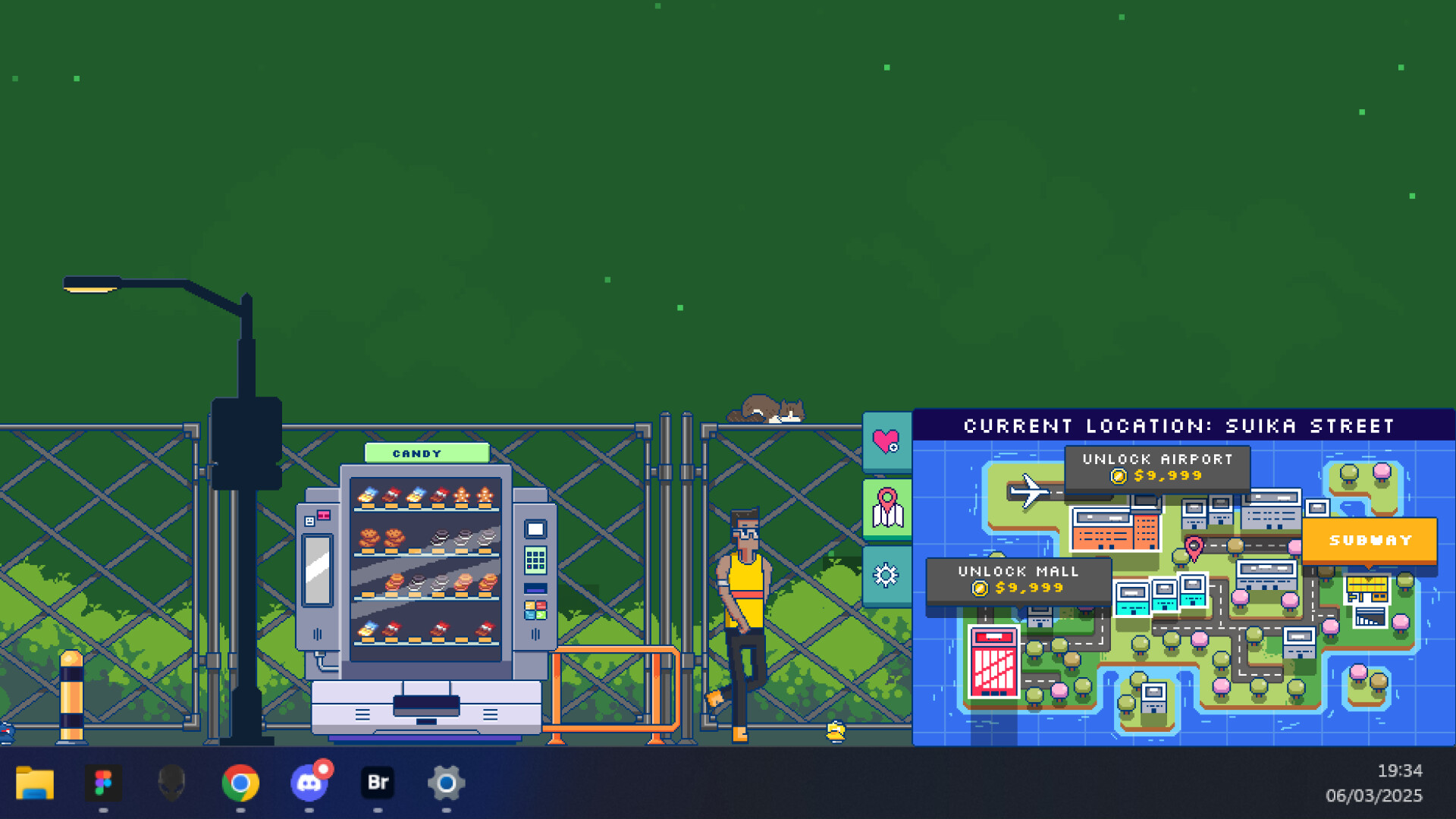 Build and manage a vending machine empire in this idle pixel art business sim that runs at the bottom of your screen. Stock machines with snacks and drinks, monitor customer demand, unlock premium locations, and maximize profits while you work or study.