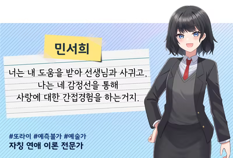 “지애 쌤이랑 사귀고 싶지?”, "너랑 지애 쌤이 잘 될 수 있게 도와줄게.” ㅡ짝사랑을 좇아 멘토링 프로그램에 들어온 주인공. 그러나 그곳에서 만난 멘티 서희는 선생님과 맺어질 수 있게 돕겠다며 이상한 제안을 해오는데—서희의 제안 뒤에 숨겨진 진짜 의도는 무엇일까? 어딘가 수상한 4차원 소녀와 함께하는 예측 불가능한 연애 협동.