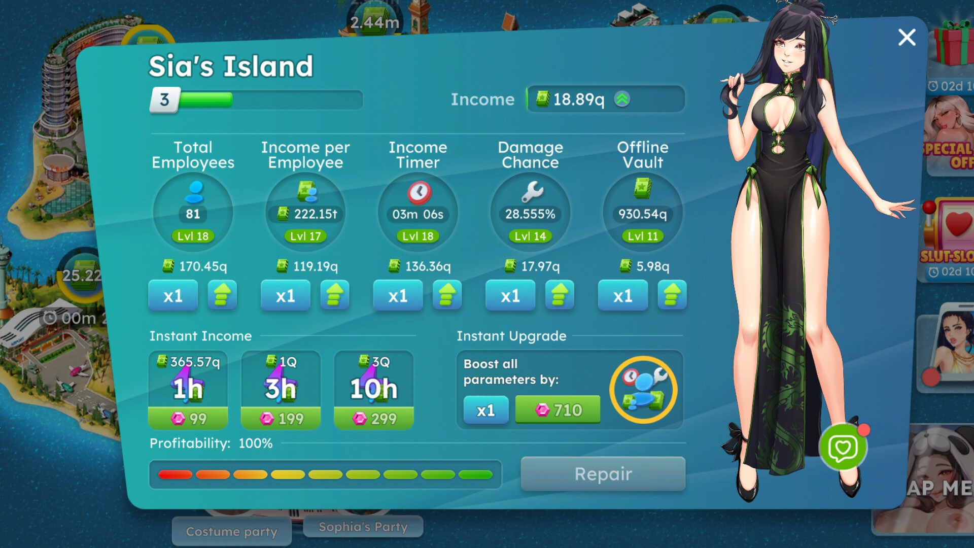 Sexy Beaches is a casual idle dating sim where you upgrade girls' tropical islands to progress your relationships. Earn resources, unlock romantic scenes, and build your own beach paradise.