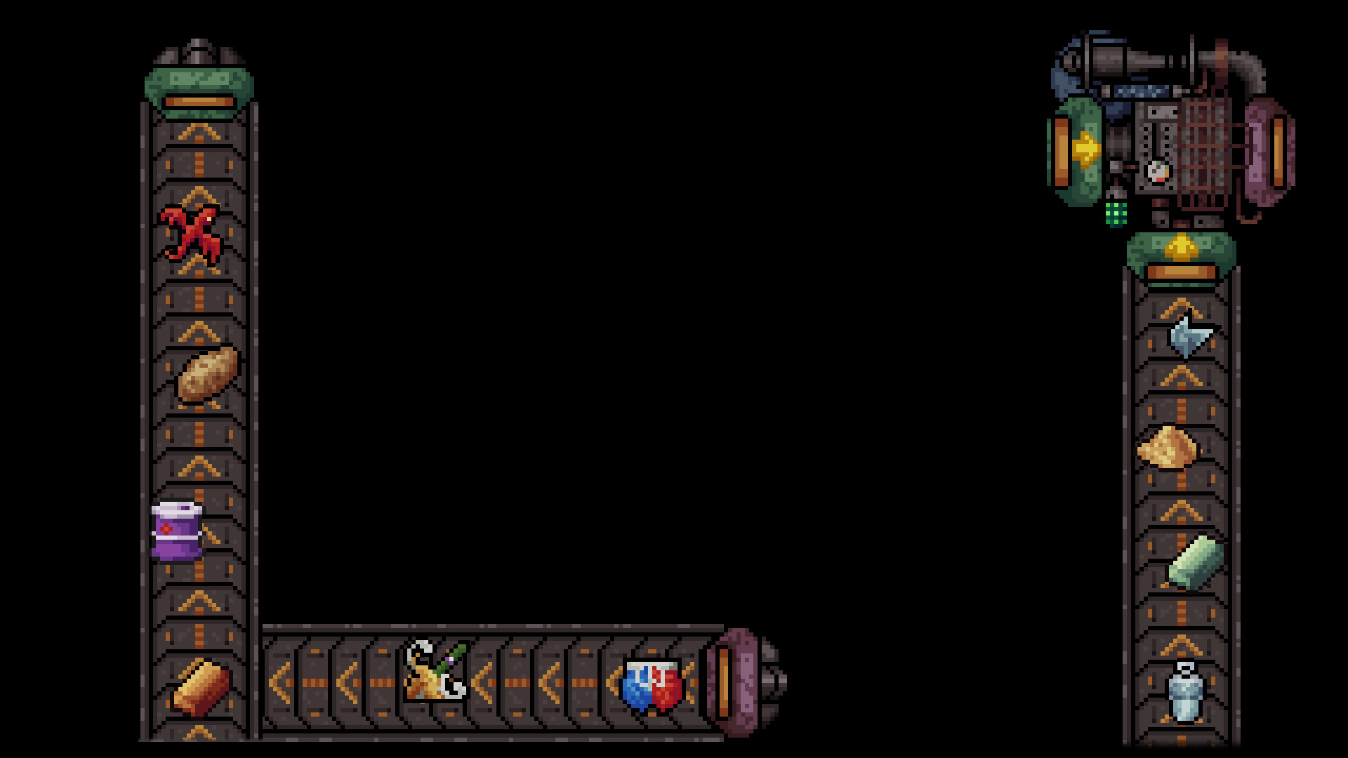 Nun, da Sie herausgefunden haben, wie Sie eine Waffe bauen, - können Sie doch gleich hunderte davon herstellen, richtig? Bauen Sie Ihre Fabrik für die Massenproduktion aus, mit Förderbändern, Schranken, Drückern, schwarzen Löchern....warten Sie...warum haben Sie ein schwarzes Loch eingebaut? Neeeeeeeeeiiiiiiiiiin
