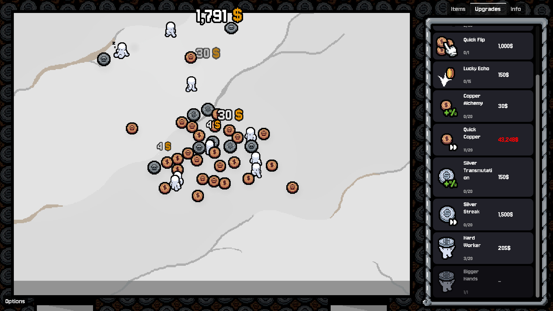 Più monete possiedi, più ne puoi lanciare. Acquista potenziamenti per farle lanciare più velocemente e ottenere più soldi. Scopri interazioni curiose e sinergie inaspettate tra i diversi tipi di monete.