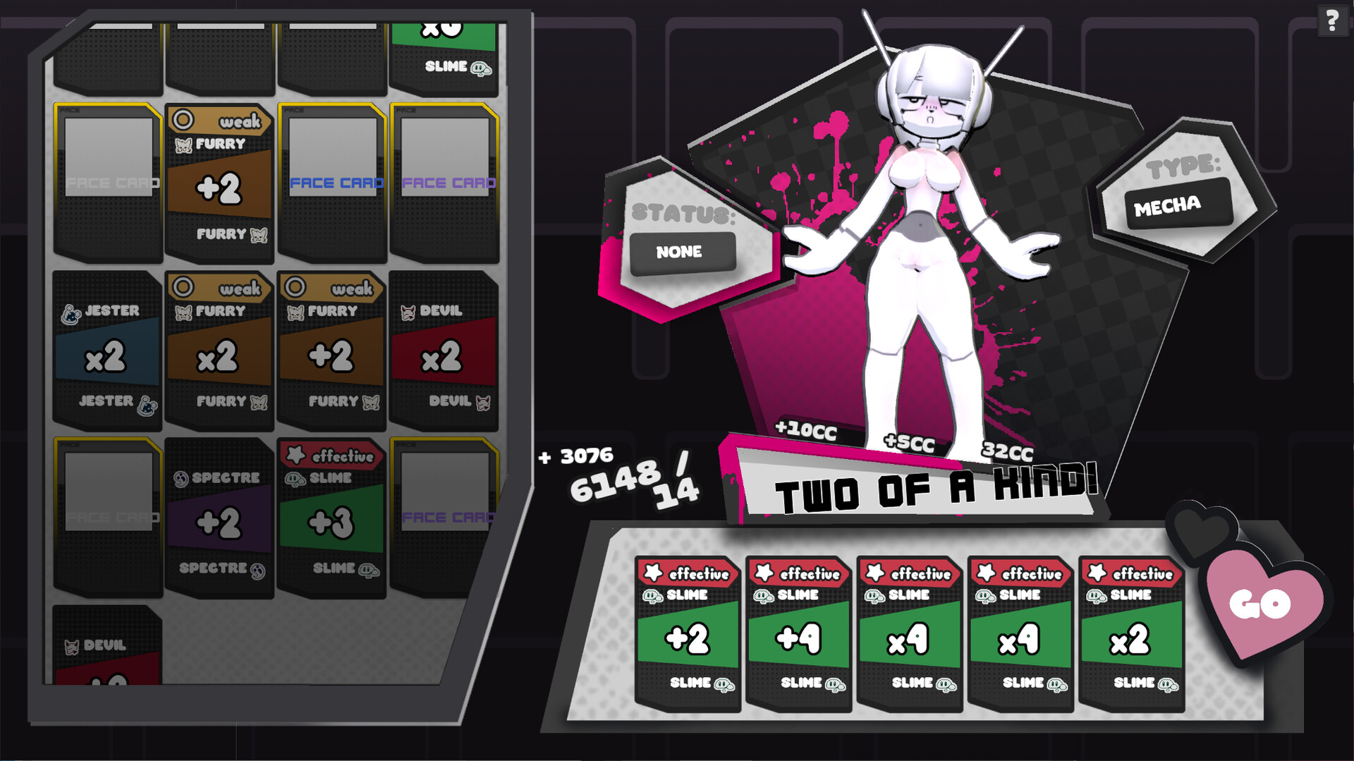 Monster girls come in different 5 types: Furry, Mecha, Slime, Devil, and Jester, each with their own card suits that are either weak or effective on them.
